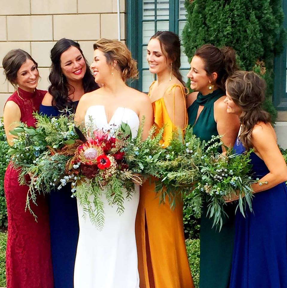 Mix and match bridesmaids’ dresses done right! We loved Lindsey’s bridesmaids’ mixed jewel tones paired with their bohemian bouquets.