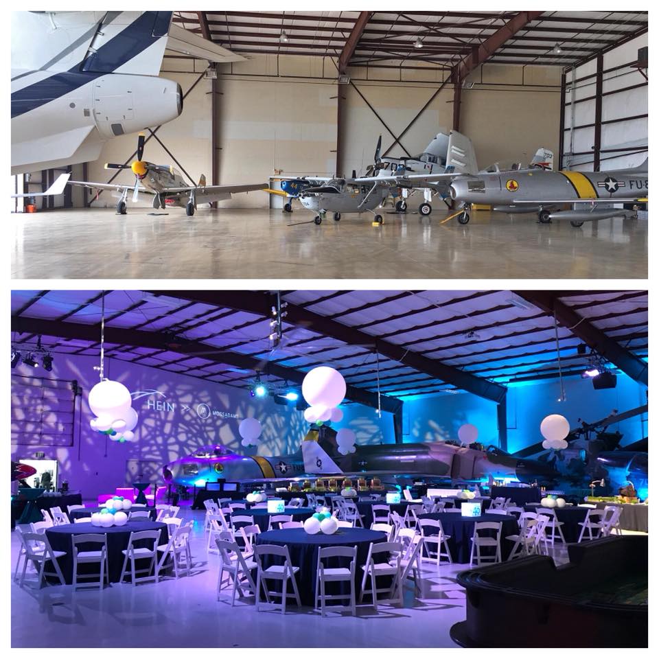 We completely transformed a hangar at the Cavanaugh Flight Museum into a colorful and festive environment for Hein’s Anniversary Party thanks to lighting from Astounding Sounds and decor from Shag Carpet!