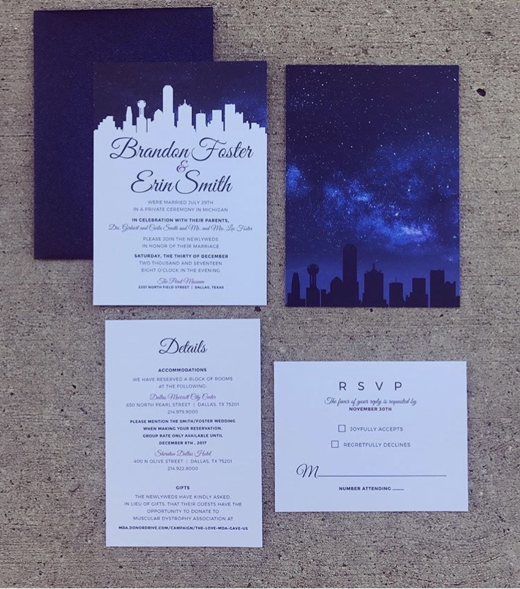 Erin and Brandon requested an elegant night-time feel to their invitations and Significantly Said Invitation Designer Abby Leal delivered on all levels, creating their Dallas night-sky invitation suite which looked magical printed on sparkly metallic paper paired with dark blue envelopes with white printing.