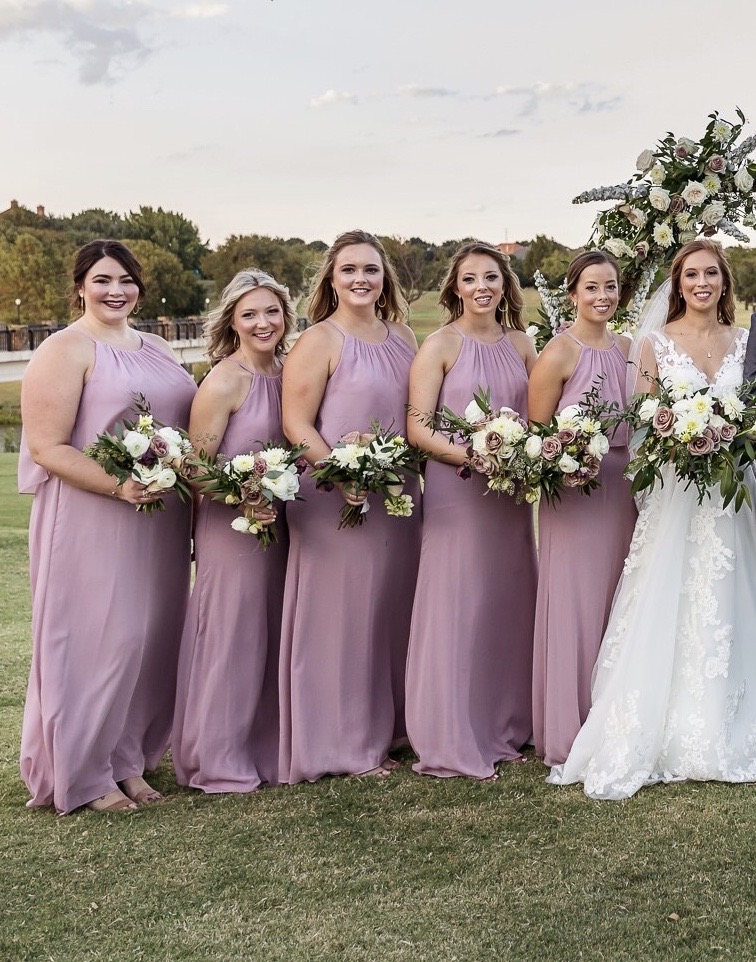 Lavender and lilac were popular bridemaids’ dress colors this year, and we loved how Alyssa’s bridesmaids’ gowns paired with their bouquets and outdoor setting!