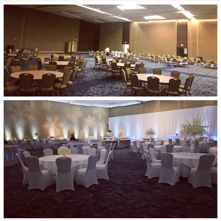 Take a stark convention center and turn it into an elegant, all white holiday party? No problem! We achieved this for Varidesk with lighting by LeForce Entertainment, draping by DFW Drape, centerpieces by Haute Floral, chair covers by AM Linens, lounge furniture by DFW Lounge Rentals, dance floor by AVSD, and white casino tables by Elite!