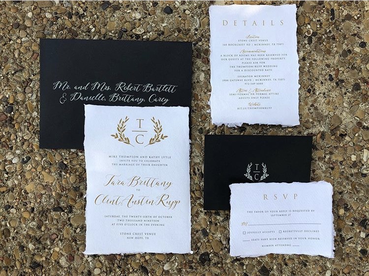 Tara & Clint’s custom designed deckle edged invitation was the perfect preview of their wedding day for their guests. We loved the specialty paper paired with the gold printing and black envelopes. Our Significantly Said designer Abby Leal did a great job with this suite!