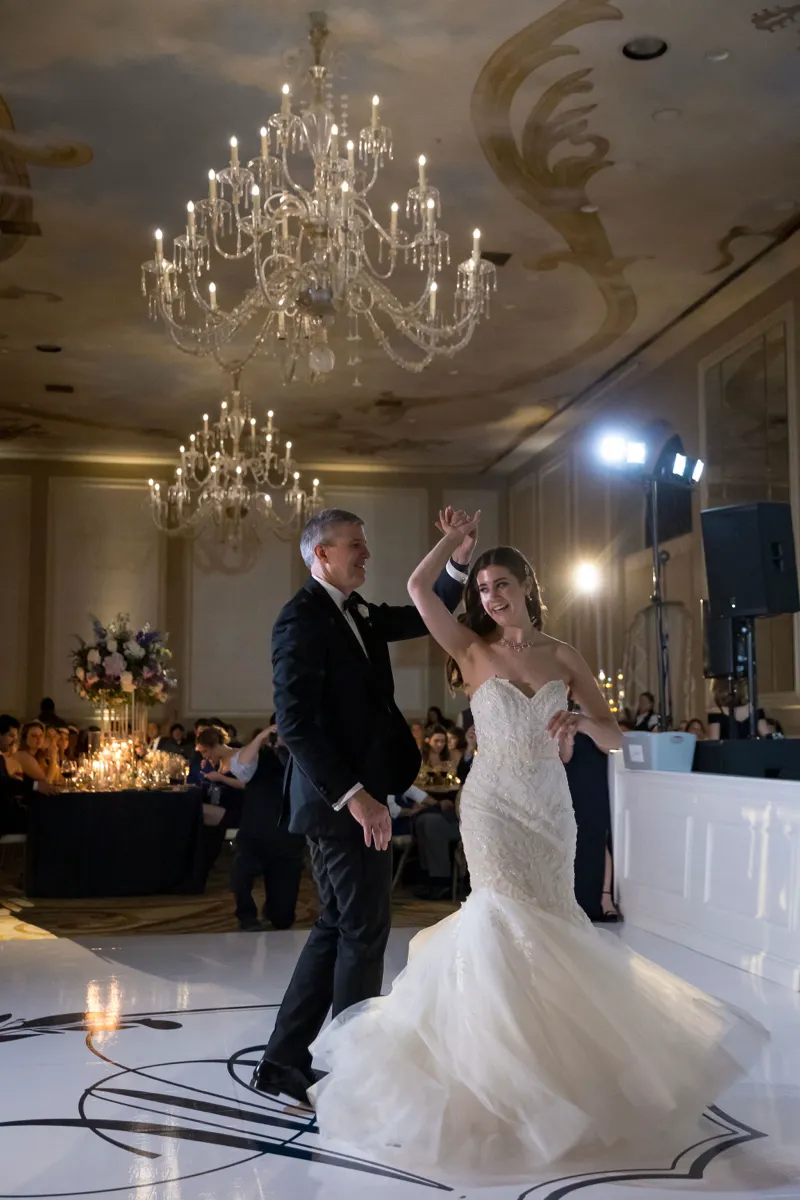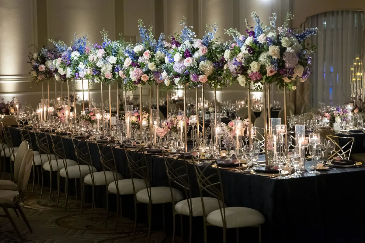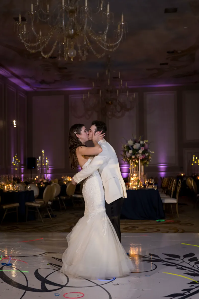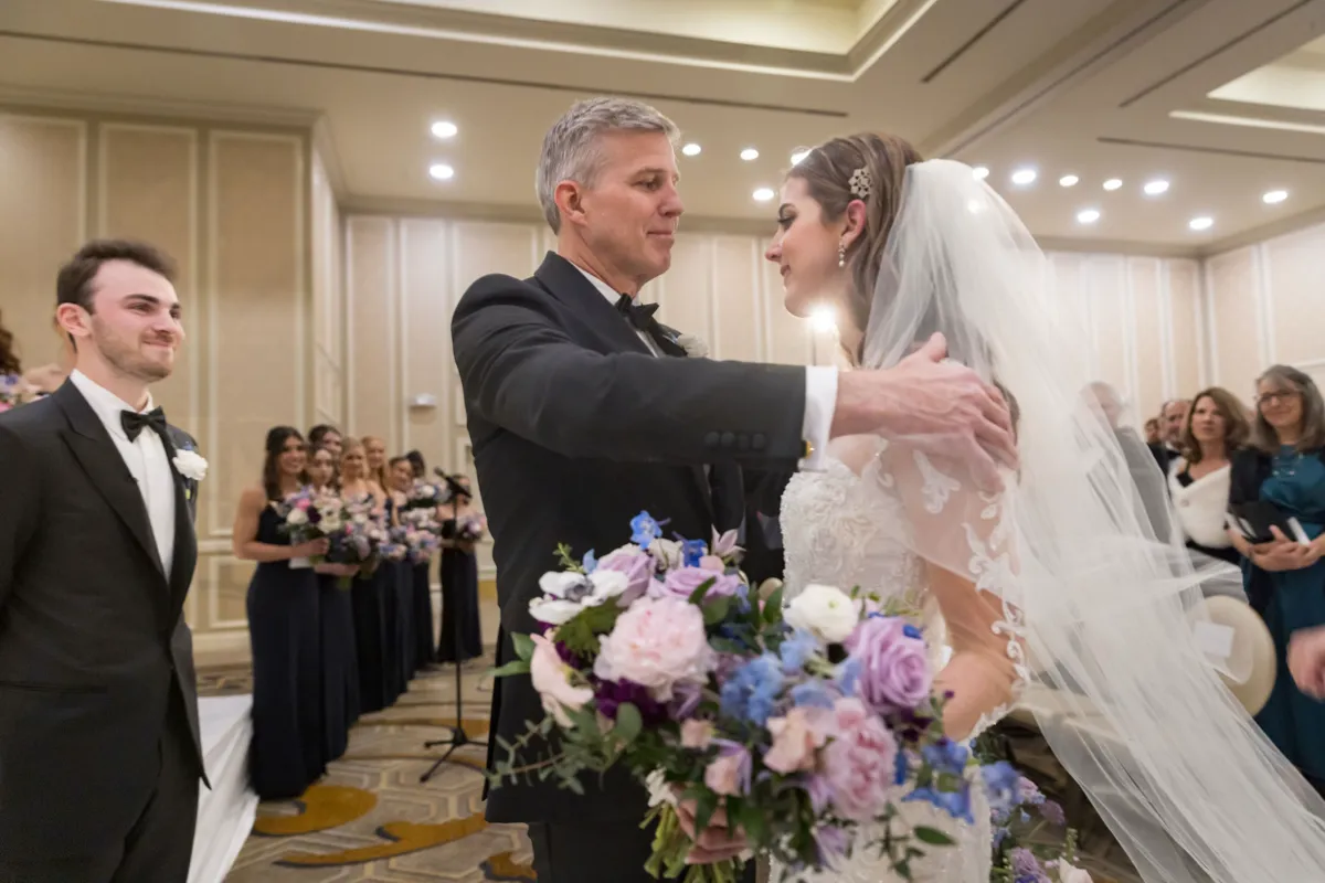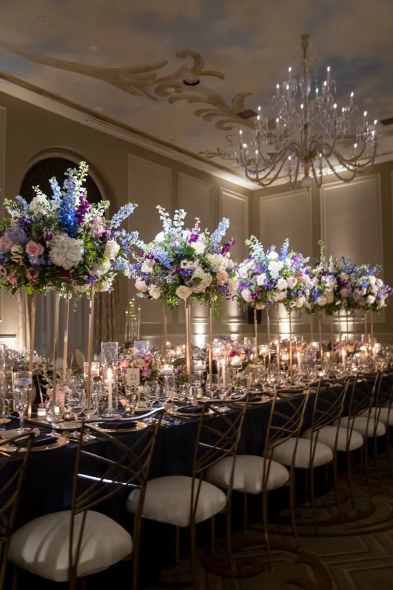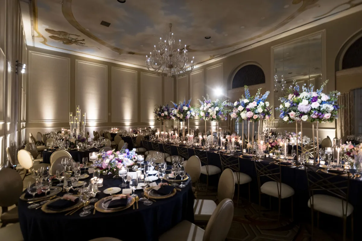 Camille & Matt’s regal wedding was a site to behold! Guests first got a taste of the elegant design with the letterpressed and engraved invitation with midnight blue and gold details designed by Significantly Said: Invitations by Significant Events. The wedding was held at a historic downtown Dallas hotel full of incredible architectural details and history. Camille’s color palette of shades of blue, shades of purple, and white looked perfect in the venue and for a winter wedding. Florals were arranged in a lovely, organic way that was both fresh and classic. Guests were greeted with champagne as they entered the ceremony room. The Jewish ceremony was held under a white chuppah adorned with a spray of florals which continued down the aisle. Cocktail Hour featured a custom made wood and floral arch for photos, a bar serving a variety of signature cocktails, as well as one poured through an ice luge with the couple’s monogram on it. The ballroom looked so elegant with crystal chandeliers and a painted ceiling above and tables below with midnight blue linens, lush florals, gold chargers and flatware, and custom paper goods. Camille & Matt’s Sweetheart Table was surrounded with a lovely meadow of floral right in front of their dance floor with custom monogram. A formal plated meal was served which guests enjoyed. Two cakes served as dessert: one a grand bridal cake and the other a football helmet shaped groom’s cake! A champagne tower provided the perfect cake pairing. A fabulous party band kept the dance floor completely packed all night. A yummy tater tot bar provided a fun late night snack. A send-off down the hotel stairs with streamers finished this incredible wedding!