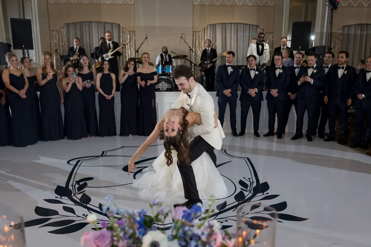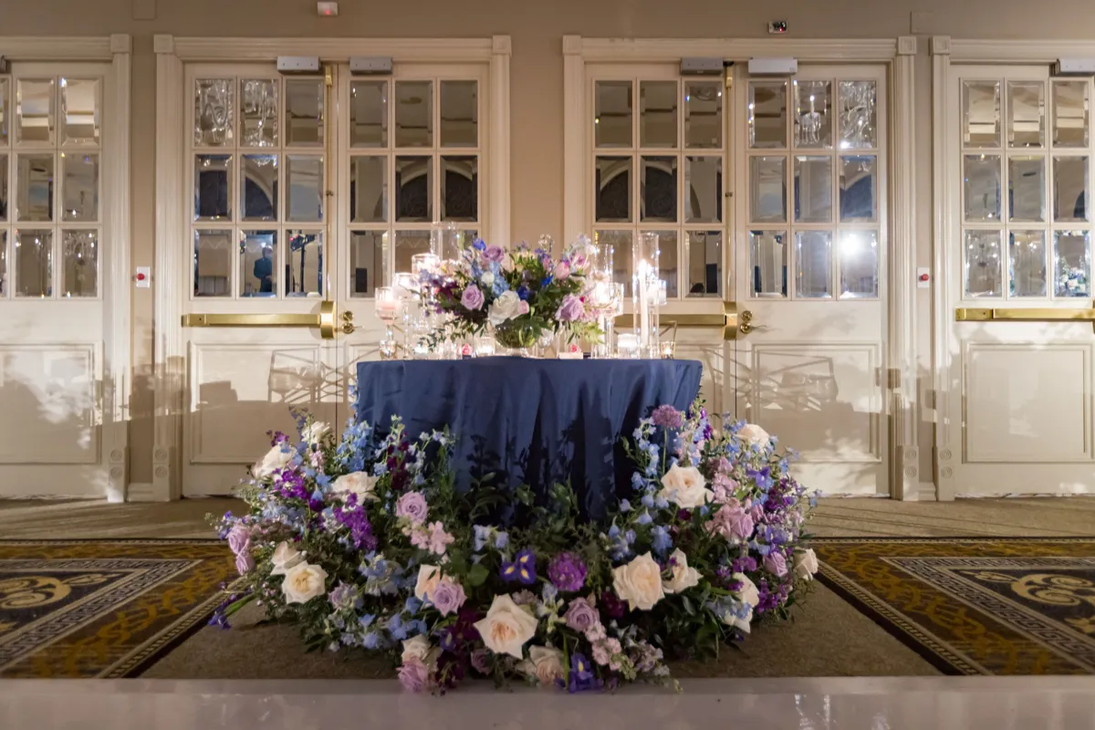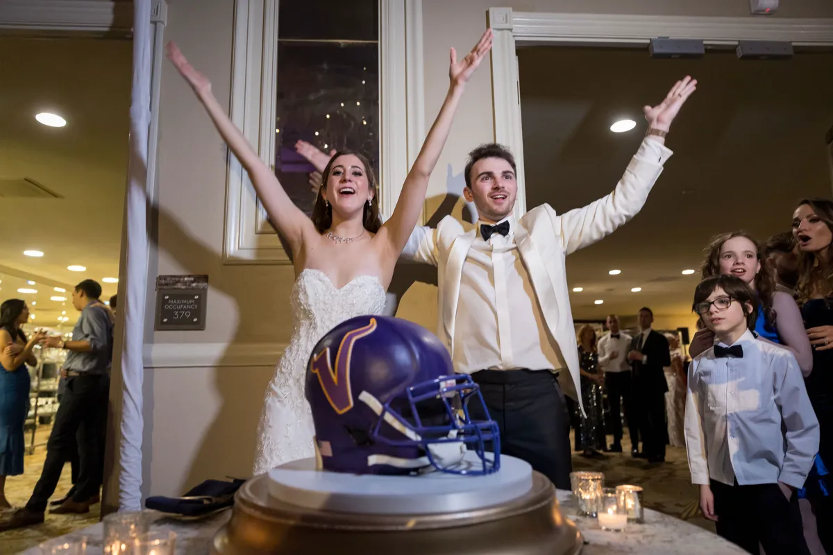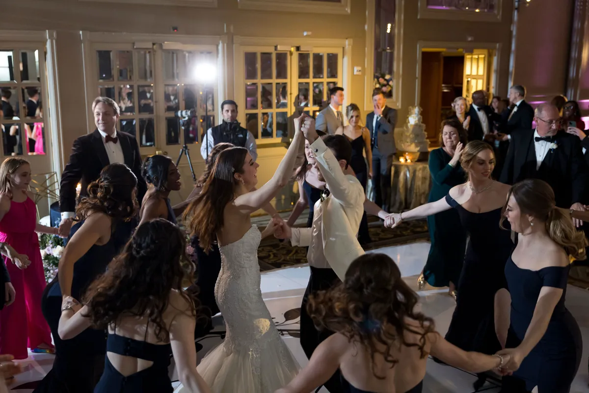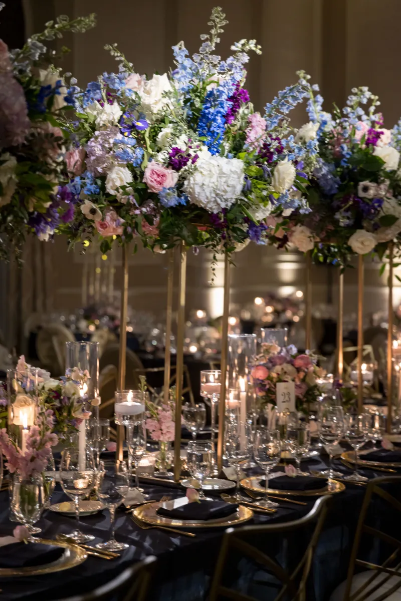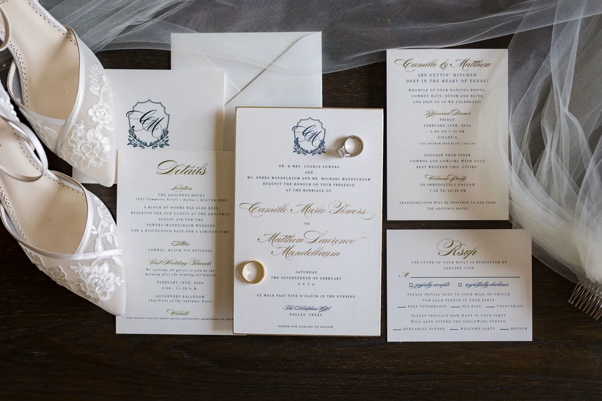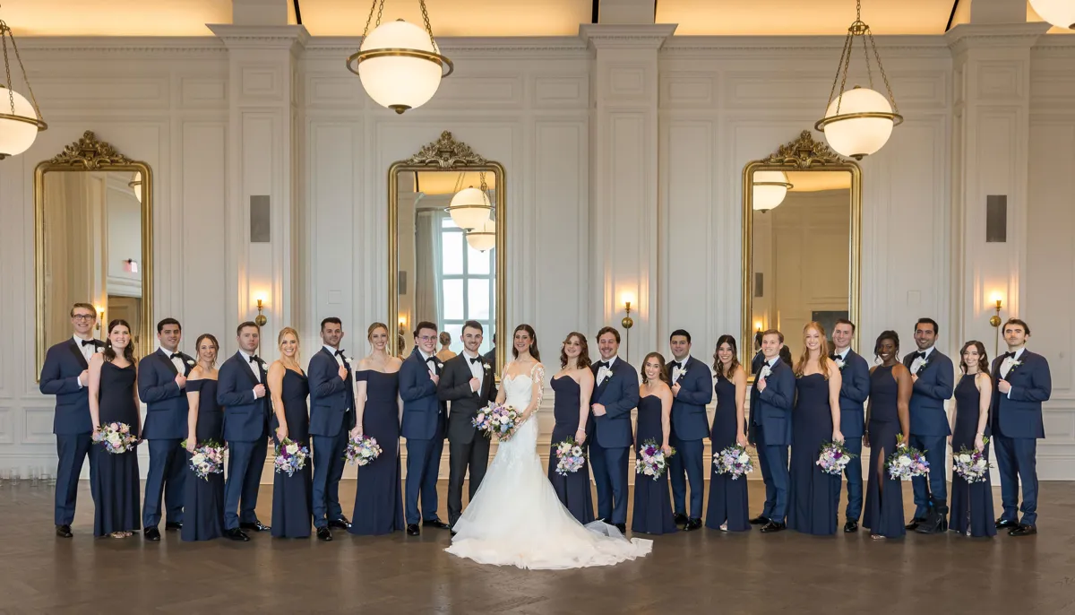 Camille & Matt’s regal wedding was a site to behold! Guests first got a taste of the elegant design with the letterpressed and engraved invitation with midnight blue and gold details designed by Significantly Said: Invitations by Significant Events. The wedding was held at a historic downtown Dallas hotel full of incredible architectural details and history. Camille’s color palette of shades of blue, shades of purple, and white looked perfect in the venue and for a winter wedding. Florals were arranged in a lovely, organic way that was both fresh and classic. Guests were greeted with champagne as they entered the ceremony room. The Jewish ceremony was held under a white chuppah adorned with a spray of florals which continued down the aisle. Cocktail Hour featured a custom made wood and floral arch for photos, a bar serving a variety of signature cocktails, as well as one poured through an ice luge with the couple’s monogram on it. The ballroom looked so elegant with crystal chandeliers and a painted ceiling above and tables below with midnight blue linens, lush florals, gold chargers and flatware, and custom paper goods. Camille & Matt’s Sweetheart Table was surrounded with a lovely meadow of floral right in front of their dance floor with custom monogram. A formal plated meal was served which guests enjoyed. Two cakes served as dessert: one a grand bridal cake and the other a football helmet shaped groom’s cake! A champagne tower provided the perfect cake pairing. A fabulous party band kept the dance floor completely packed all night. A yummy tater tot bar provided a fun late night snack. A send-off down the hotel stairs with streamers finished this incredible wedding!