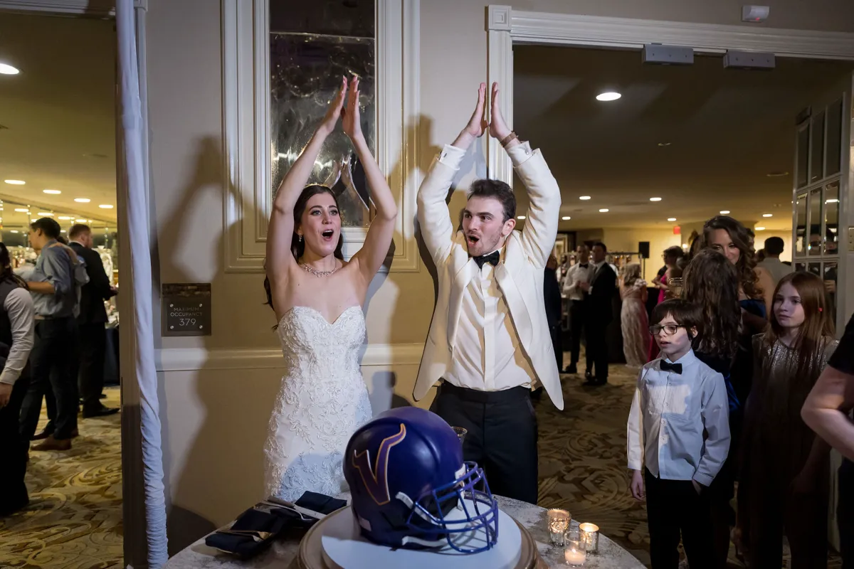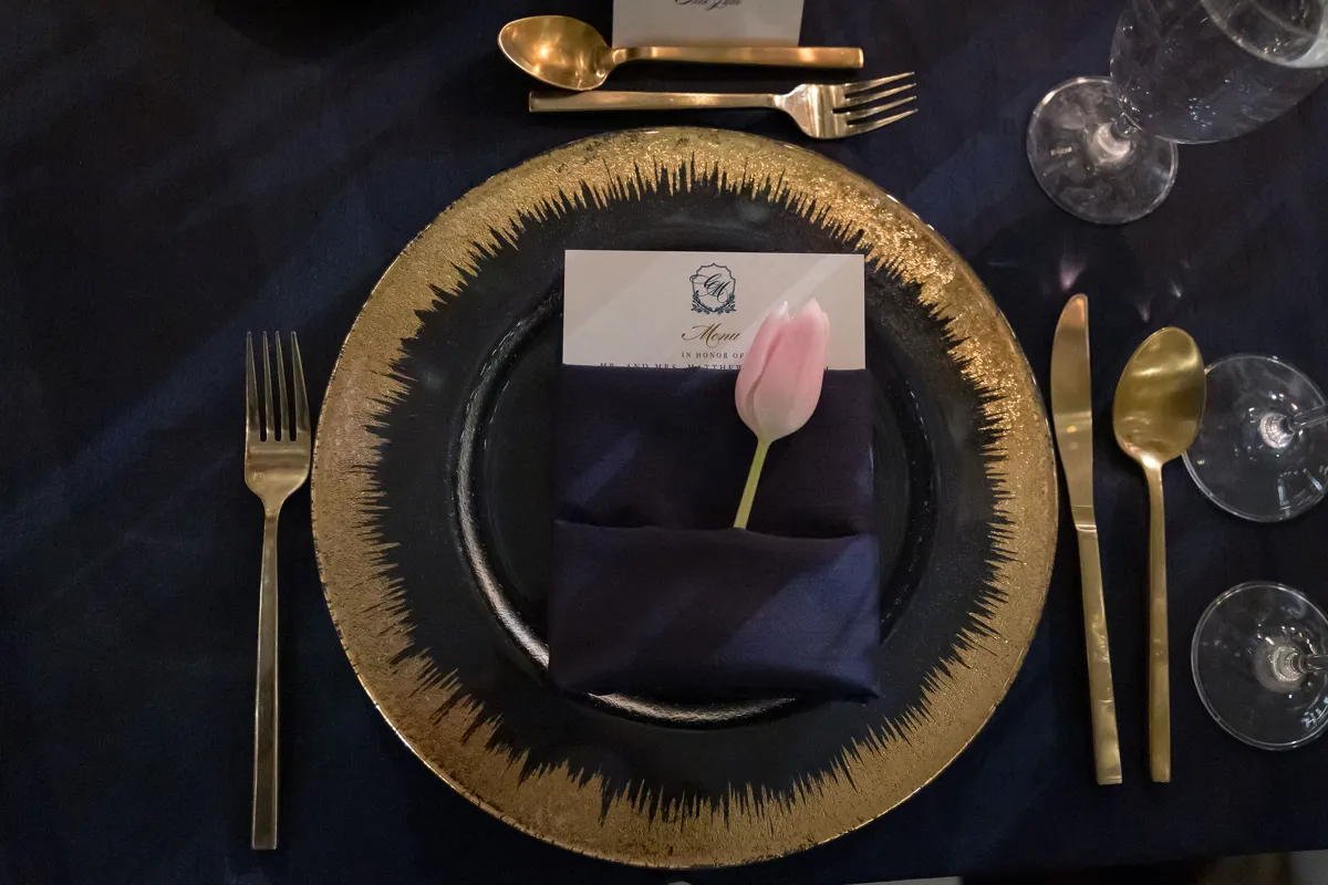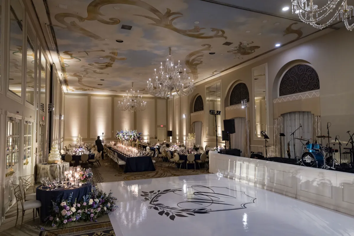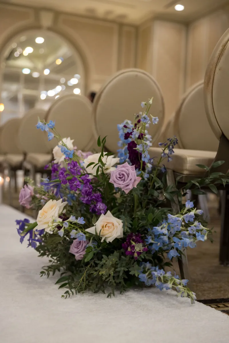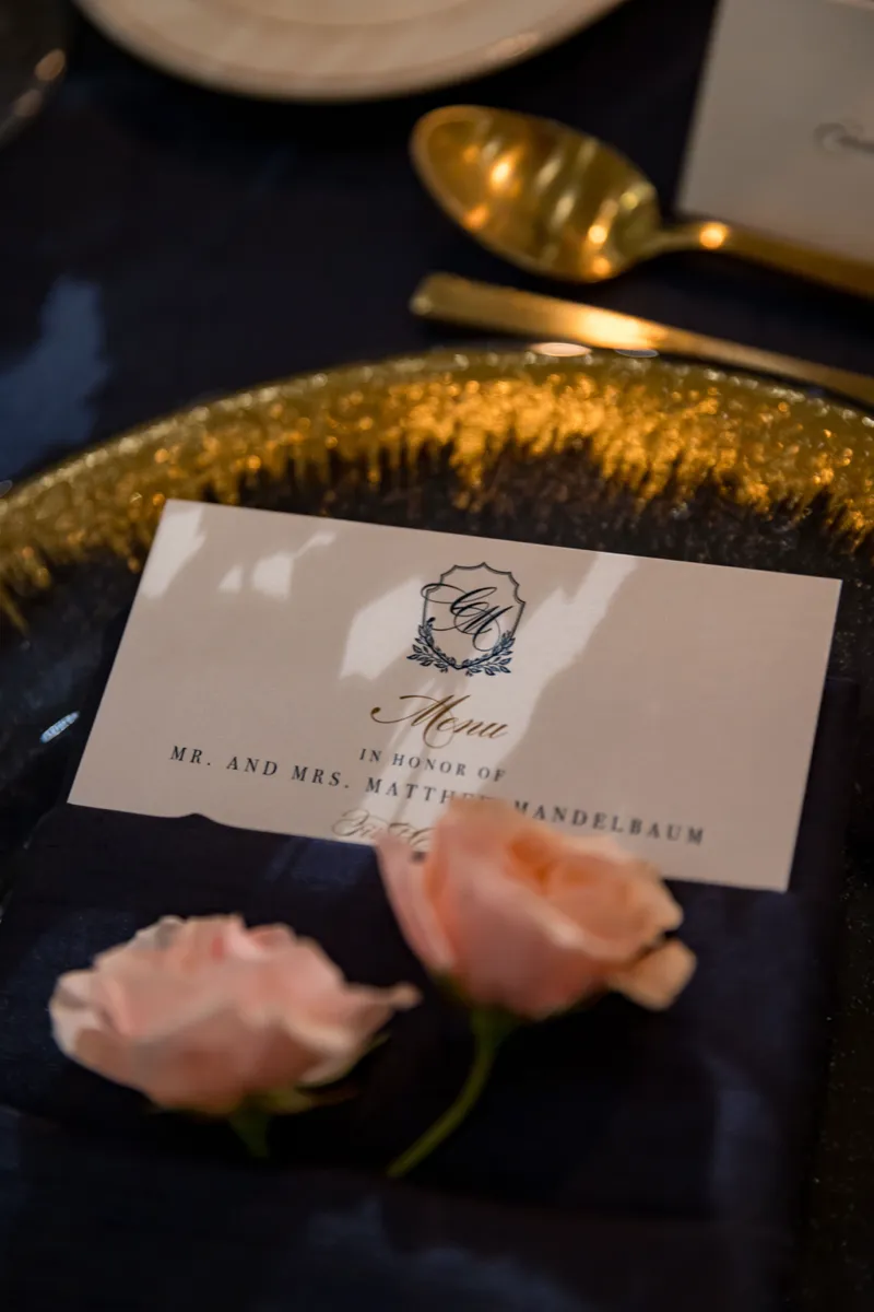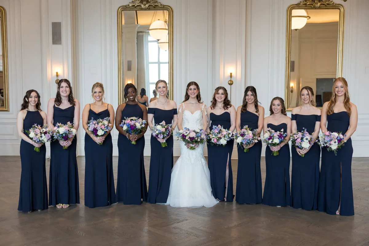 Camille & Matt’s regal wedding was a site to behold! Guests first got a taste of the elegant design with the letterpressed and engraved invitation with midnight blue and gold details designed by Significantly Said: Invitations by Significant Events. The wedding was held at a historic downtown Dallas hotel full of incredible architectural details and history. Camille’s color palette of shades of blue, shades of purple, and white looked perfect in the venue and for a winter wedding. Florals were arranged in a lovely, organic way that was both fresh and classic. Guests were greeted with champagne as they entered the ceremony room. The Jewish ceremony was held under a white chuppah adorned with a spray of florals which continued down the aisle. Cocktail Hour featured a custom made wood and floral arch for photos, a bar serving a variety of signature cocktails, as well as one poured through an ice luge with the couple’s monogram on it. The ballroom looked so elegant with crystal chandeliers and a painted ceiling above and tables below with midnight blue linens, lush florals, gold chargers and flatware, and custom paper goods. Camille & Matt’s Sweetheart Table was surrounded with a lovely meadow of floral right in front of their dance floor with custom monogram. A formal plated meal was served which guests enjoyed. Two cakes served as dessert: one a grand bridal cake and the other a football helmet shaped groom’s cake! A champagne tower provided the perfect cake pairing. A fabulous party band kept the dance floor completely packed all night. A yummy tater tot bar provided a fun late night snack. A send-off down the hotel stairs with streamers finished this incredible wedding!