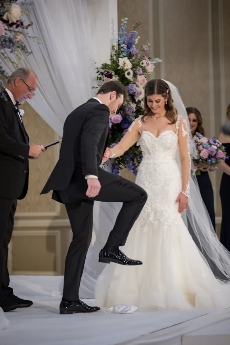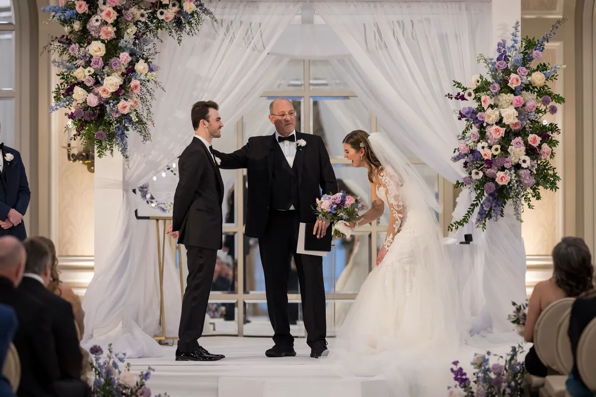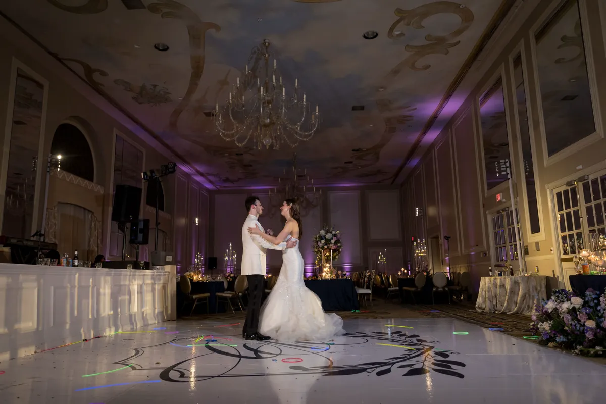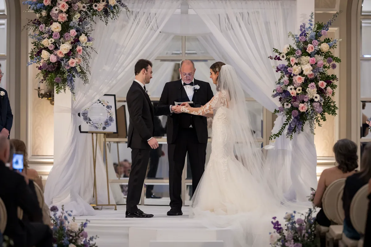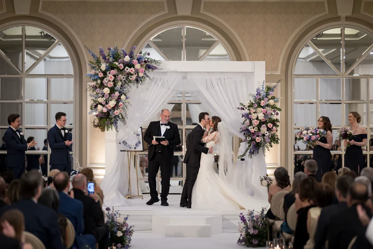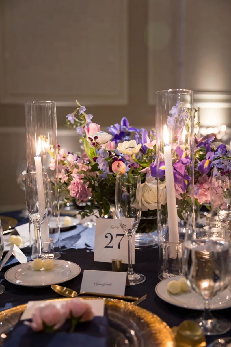 Camille & Matt’s regal wedding was a site to behold! Guests first got a taste of the elegant design with the letterpressed and engraved invitation with midnight blue and gold details designed by Significantly Said: Invitations by Significant Events. The wedding was held at a historic downtown Dallas hotel full of incredible architectural details and history. Camille’s color palette of shades of blue, shades of purple, and white looked perfect in the venue and for a winter wedding. Florals were arranged in a lovely, organic way that was both fresh and classic. Guests were greeted with champagne as they entered the ceremony room. The Jewish ceremony was held under a white chuppah adorned with a spray of florals which continued down the aisle. Cocktail Hour featured a custom made wood and floral arch for photos, a bar serving a variety of signature cocktails, as well as one poured through an ice luge with the couple’s monogram on it. The ballroom looked so elegant with crystal chandeliers and a painted ceiling above and tables below with midnight blue linens, lush florals, gold chargers and flatware, and custom paper goods. Camille & Matt’s Sweetheart Table was surrounded with a lovely meadow of floral right in front of their dance floor with custom monogram. A formal plated meal was served which guests enjoyed. Two cakes served as dessert: one a grand bridal cake and the other a football helmet shaped groom’s cake! A champagne tower provided the perfect cake pairing. A fabulous party band kept the dance floor completely packed all night. A yummy tater tot bar provided a fun late night snack. A send-off down the hotel stairs with streamers finished this incredible wedding!