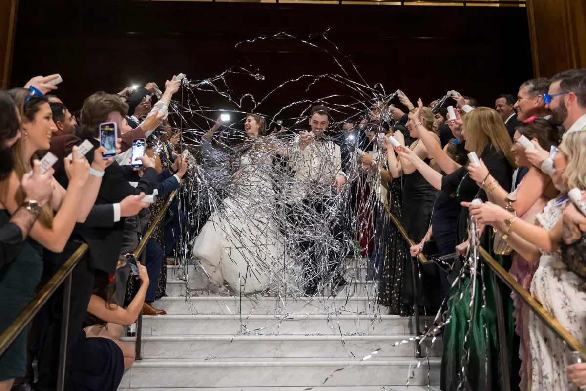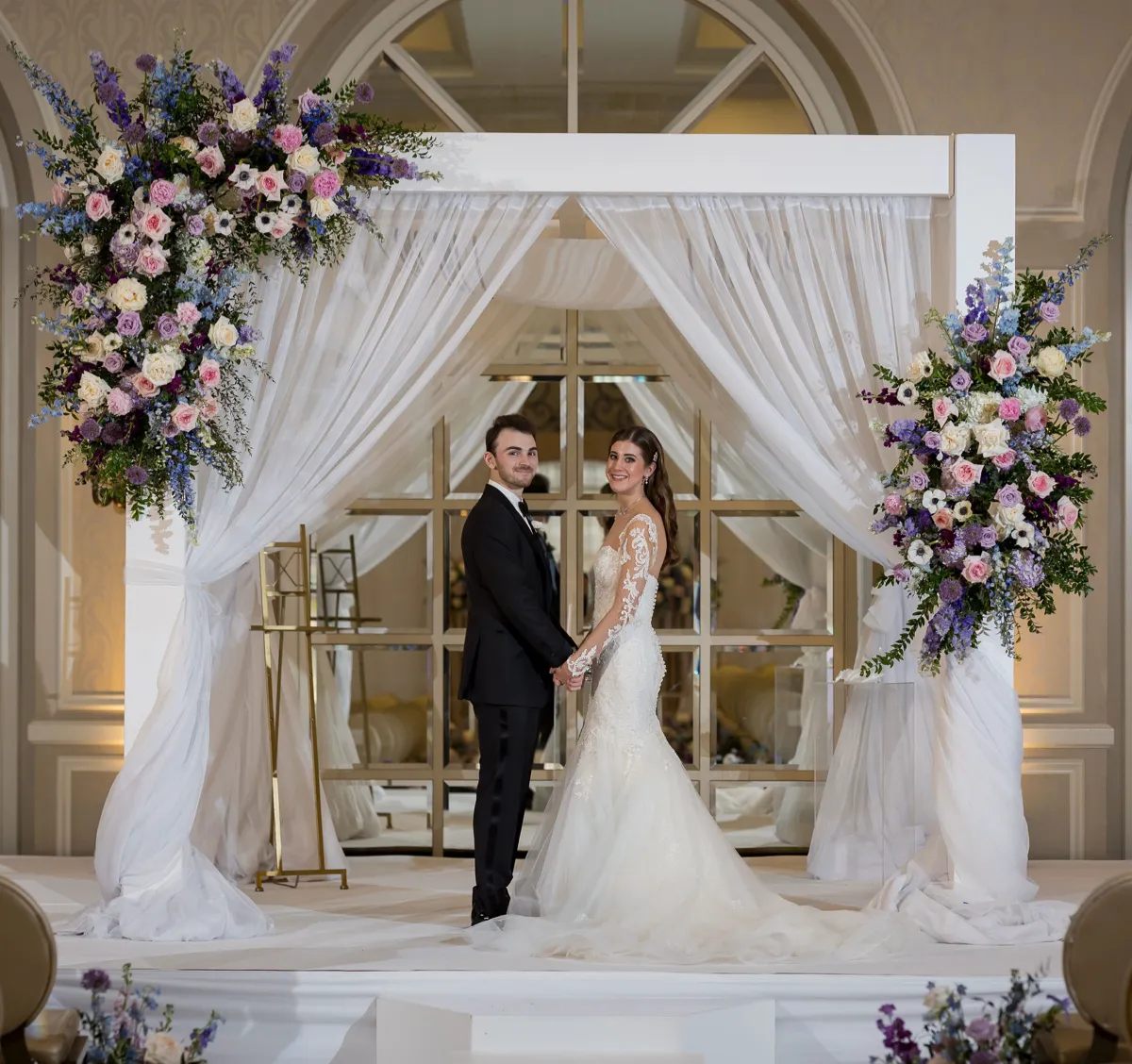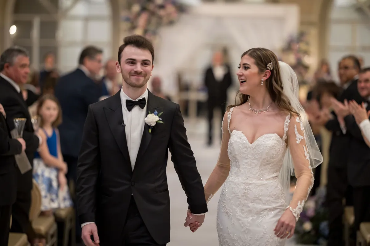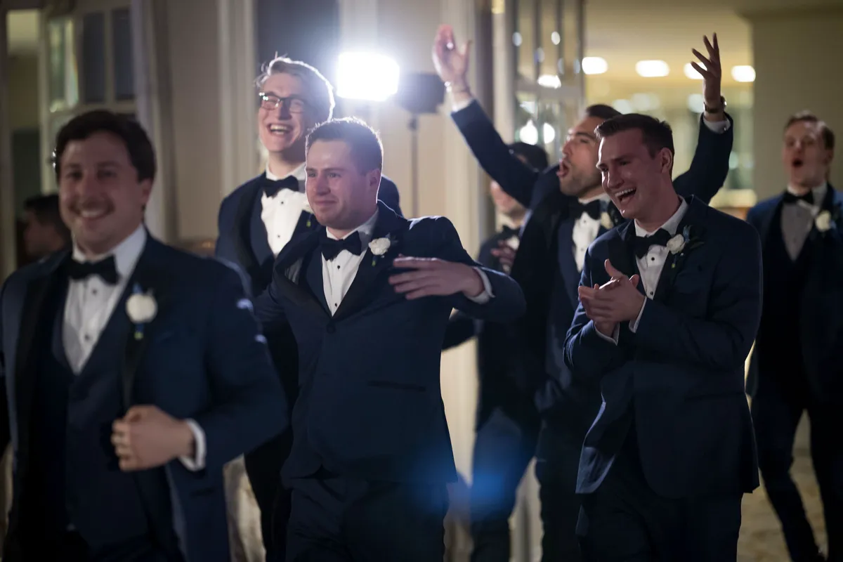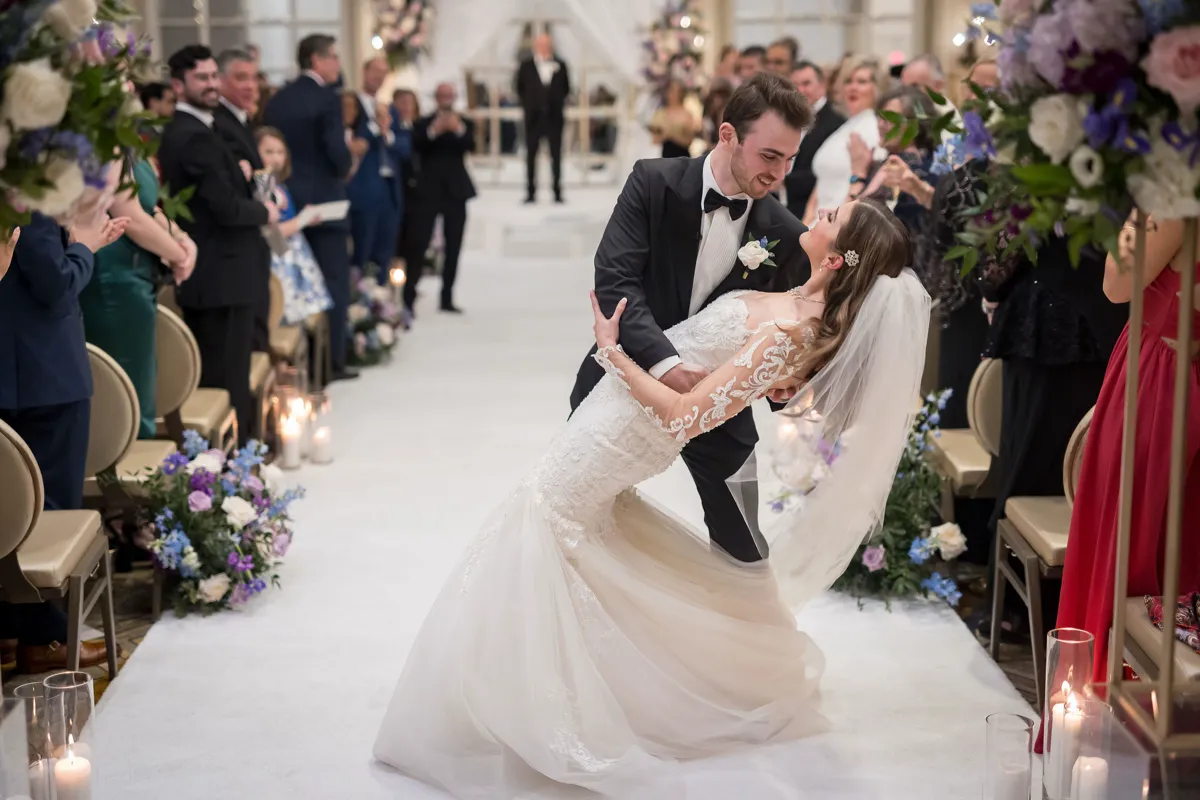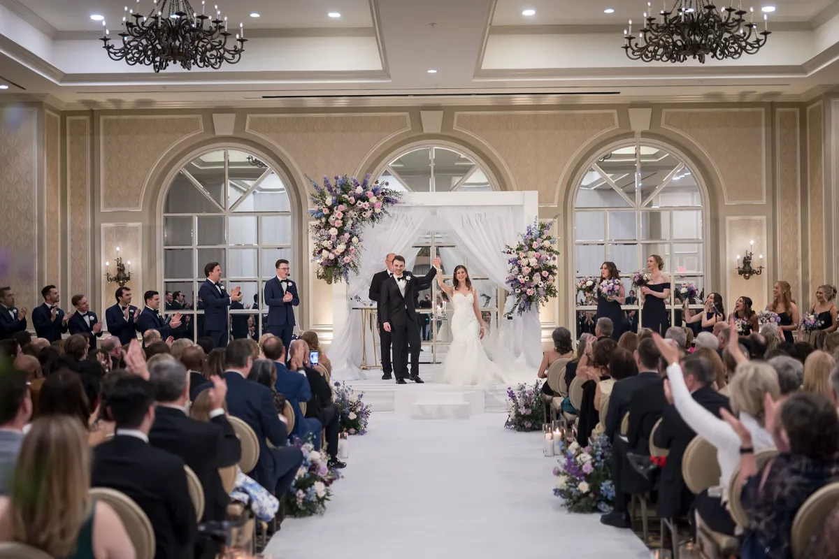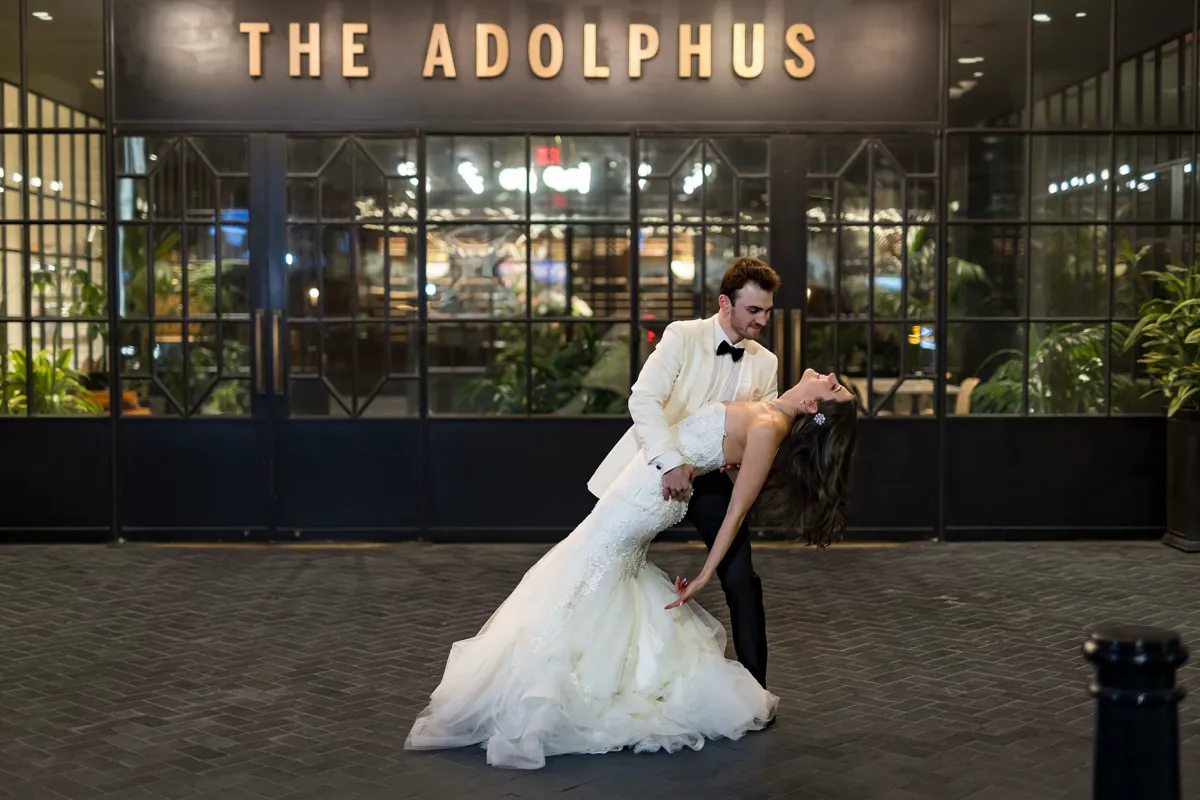 Camille & Matt’s regal wedding was a site to behold! Guests first got a taste of the elegant design with the letterpressed and engraved invitation with midnight blue and gold details designed by Significantly Said: Invitations by Significant Events. The wedding was held at a historic downtown Dallas hotel full of incredible architectural details and history. Camille’s color palette of shades of blue, shades of purple, and white looked perfect in the venue and for a winter wedding. Florals were arranged in a lovely, organic way that was both fresh and classic. Guests were greeted with champagne as they entered the ceremony room. The Jewish ceremony was held under a white chuppah adorned with a spray of florals which continued down the aisle. Cocktail Hour featured a custom made wood and floral arch for photos, a bar serving a variety of signature cocktails, as well as one poured through an ice luge with the couple’s monogram on it. The ballroom looked so elegant with crystal chandeliers and a painted ceiling above and tables below with midnight blue linens, lush florals, gold chargers and flatware, and custom paper goods. Camille & Matt’s Sweetheart Table was surrounded with a lovely meadow of floral right in front of their dance floor with custom monogram. A formal plated meal was served which guests enjoyed. Two cakes served as dessert: one a grand bridal cake and the other a football helmet shaped groom’s cake! A champagne tower provided the perfect cake pairing. A fabulous party band kept the dance floor completely packed all night. A yummy tater tot bar provided a fun late night snack. A send-off down the hotel stairs with streamers finished this incredible wedding!