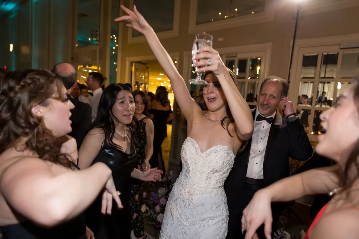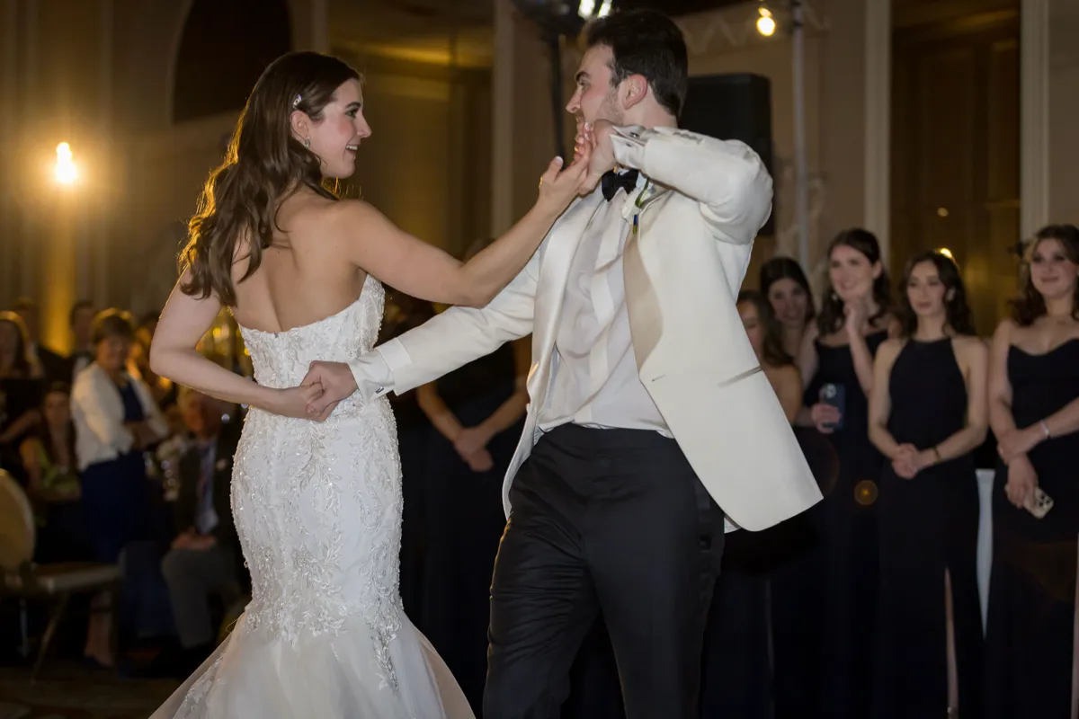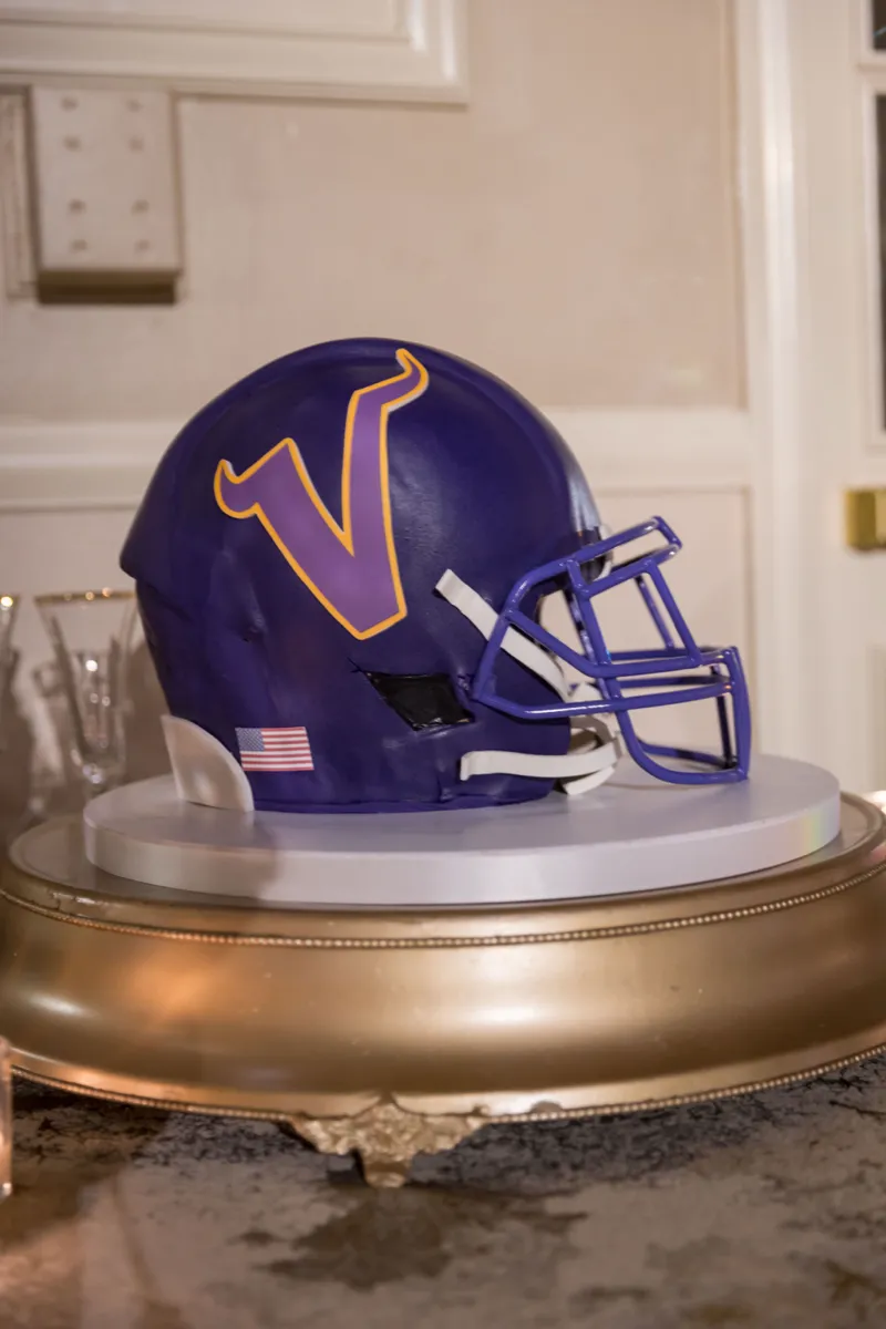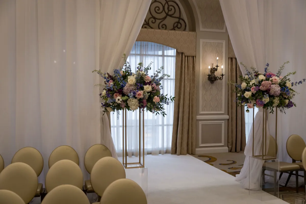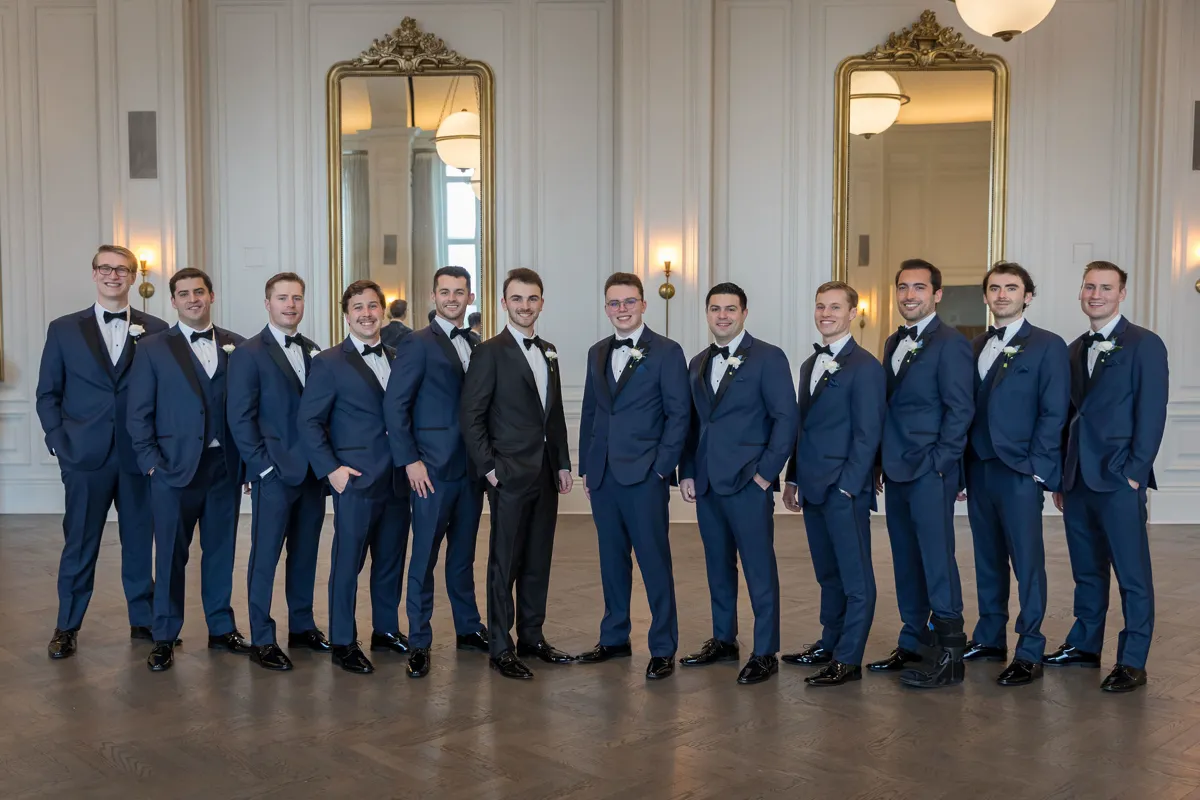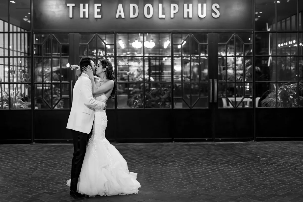 Camille & Matt’s regal wedding was a site to behold! Guests first got a taste of the elegant design with the letterpressed and engraved invitation with midnight blue and gold details designed by Significantly Said: Invitations by Significant Events. The wedding was held at a historic downtown Dallas hotel full of incredible architectural details and history. Camille’s color palette of shades of blue, shades of purple, and white looked perfect in the venue and for a winter wedding. Florals were arranged in a lovely, organic way that was both fresh and classic. Guests were greeted with champagne as they entered the ceremony room. The Jewish ceremony was held under a white chuppah adorned with a spray of florals which continued down the aisle. Cocktail Hour featured a custom made wood and floral arch for photos, a bar serving a variety of signature cocktails, as well as one poured through an ice luge with the couple’s monogram on it. The ballroom looked so elegant with crystal chandeliers and a painted ceiling above and tables below with midnight blue linens, lush florals, gold chargers and flatware, and custom paper goods. Camille & Matt’s Sweetheart Table was surrounded with a lovely meadow of floral right in front of their dance floor with custom monogram. A formal plated meal was served which guests enjoyed. Two cakes served as dessert: one a grand bridal cake and the other a football helmet shaped groom’s cake! A champagne tower provided the perfect cake pairing. A fabulous party band kept the dance floor completely packed all night. A yummy tater tot bar provided a fun late night snack. A send-off down the hotel stairs with streamers finished this incredible wedding!