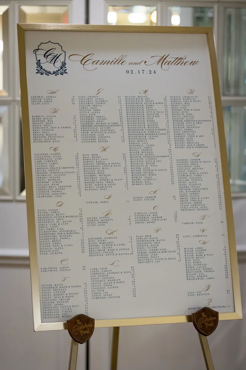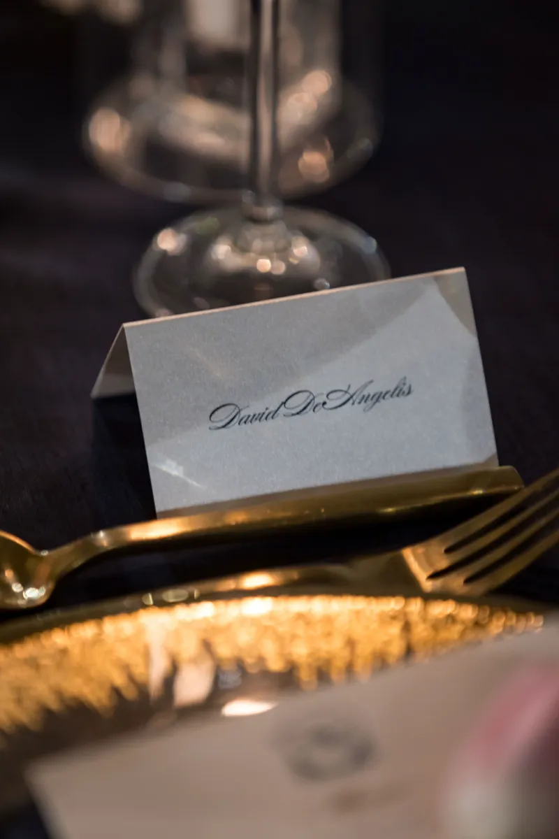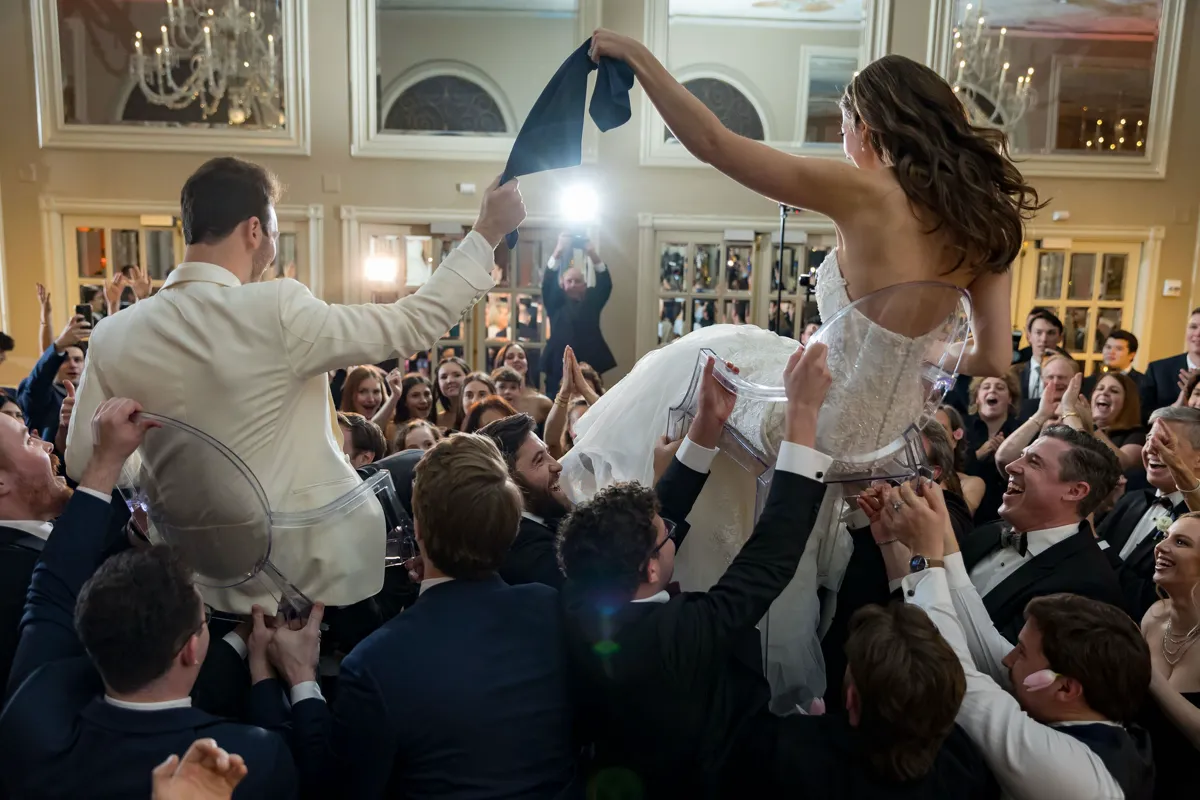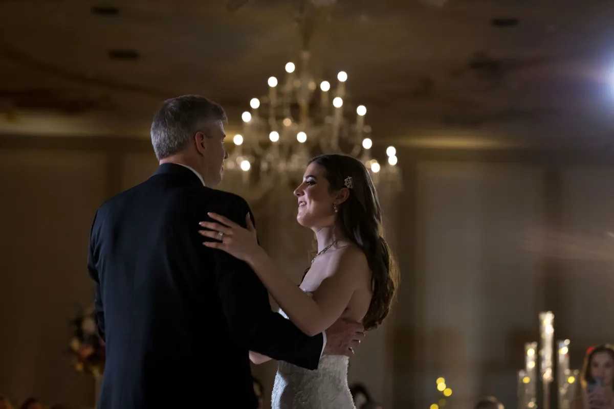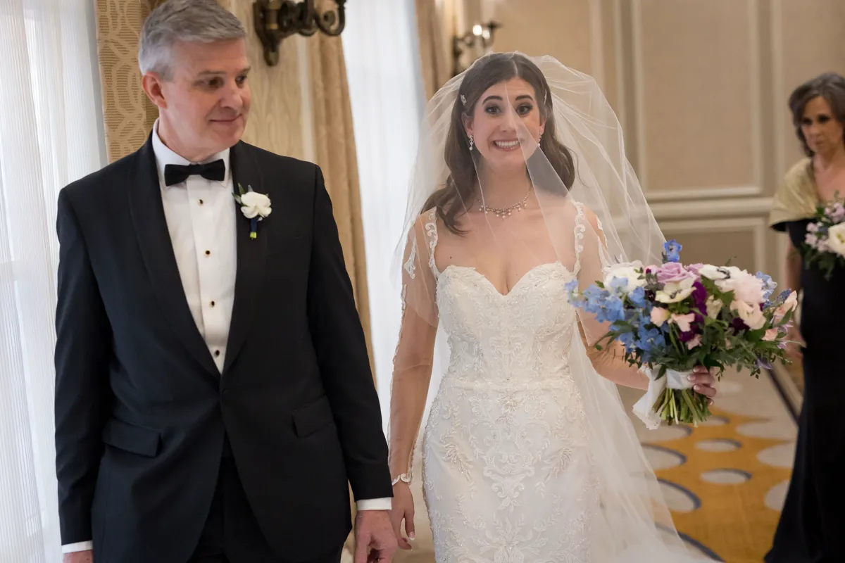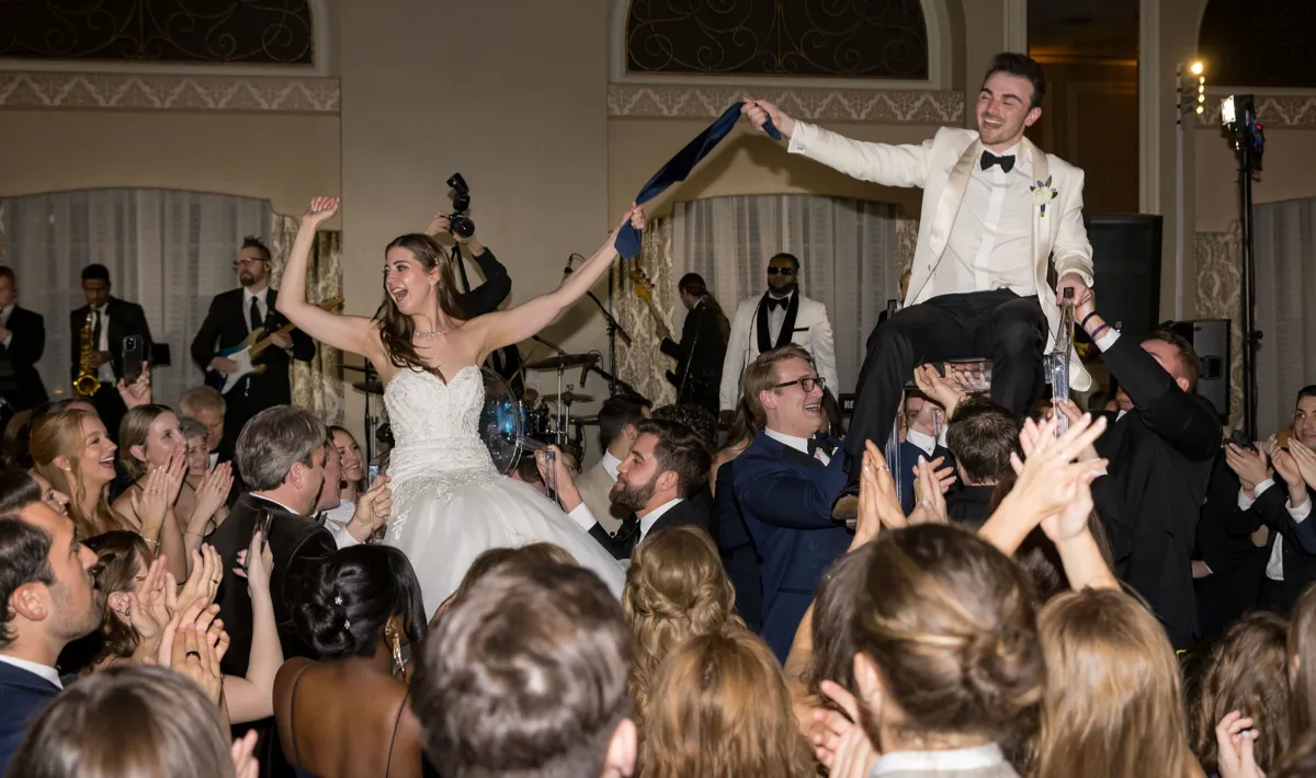 Camille & Matt’s regal wedding was a site to behold! Guests first got a taste of the elegant design with the letterpressed and engraved invitation with midnight blue and gold details designed by Significantly Said: Invitations by Significant Events. The wedding was held at a historic downtown Dallas hotel full of incredible architectural details and history. Camille’s color palette of shades of blue, shades of purple, and white looked perfect in the venue and for a winter wedding. Florals were arranged in a lovely, organic way that was both fresh and classic. Guests were greeted with champagne as they entered the ceremony room. The Jewish ceremony was held under a white chuppah adorned with a spray of florals which continued down the aisle. Cocktail Hour featured a custom made wood and floral arch for photos, a bar serving a variety of signature cocktails, as well as one poured through an ice luge with the couple’s monogram on it. The ballroom looked so elegant with crystal chandeliers and a painted ceiling above and tables below with midnight blue linens, lush florals, gold chargers and flatware, and custom paper goods. Camille & Matt’s Sweetheart Table was surrounded with a lovely meadow of floral right in front of their dance floor with custom monogram. A formal plated meal was served which guests enjoyed. Two cakes served as dessert: one a grand bridal cake and the other a football helmet shaped groom’s cake! A champagne tower provided the perfect cake pairing. A fabulous party band kept the dance floor completely packed all night. A yummy tater tot bar provided a fun late night snack. A send-off down the hotel stairs with streamers finished this incredible wedding!