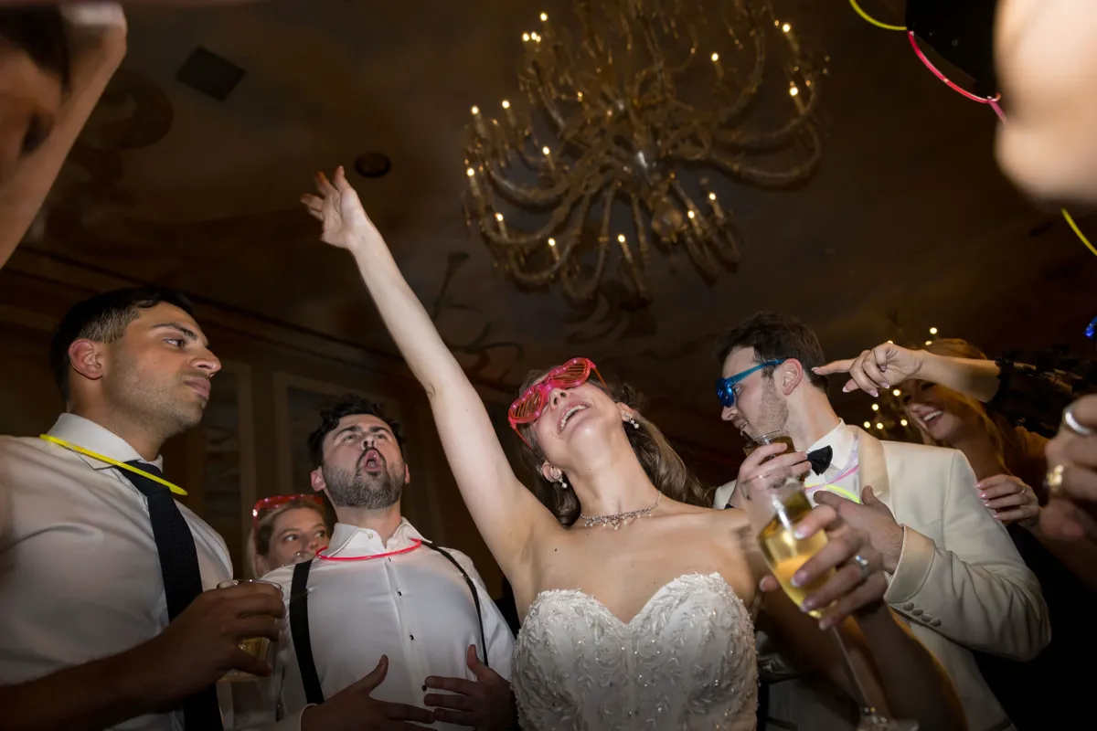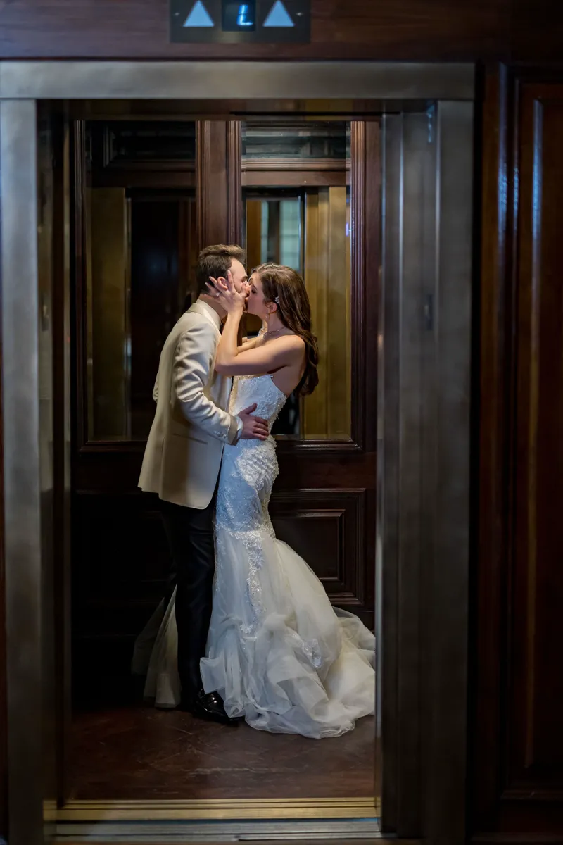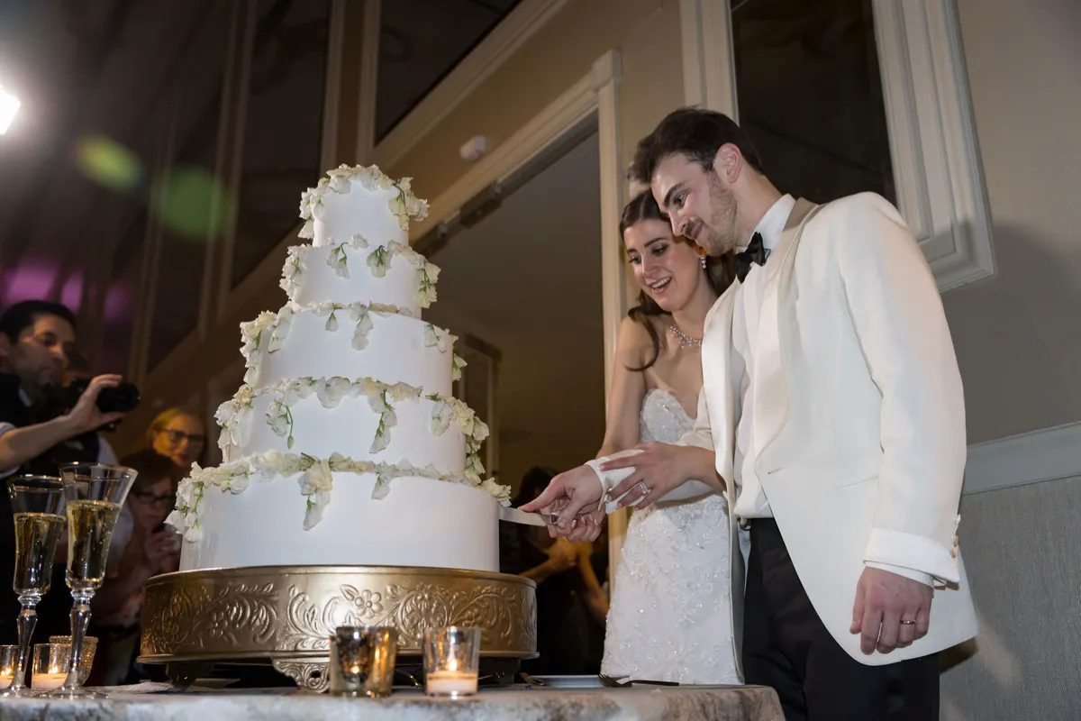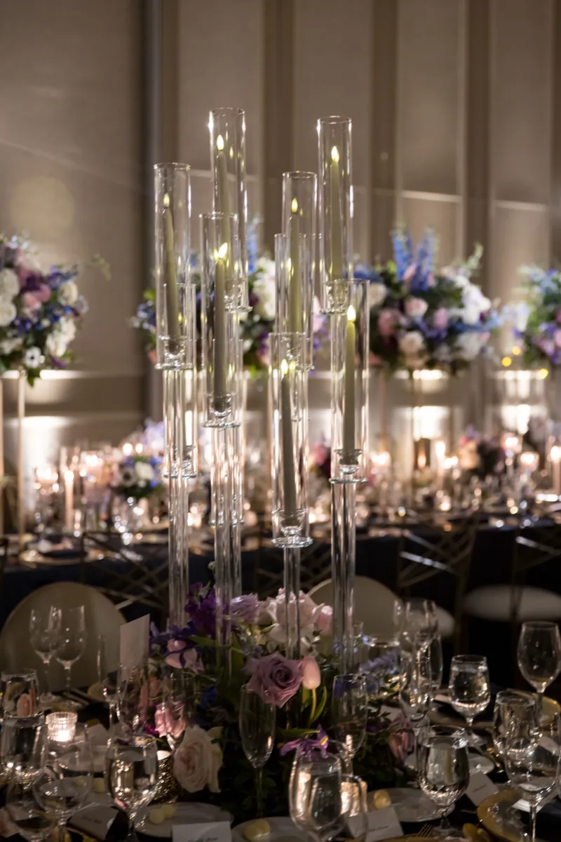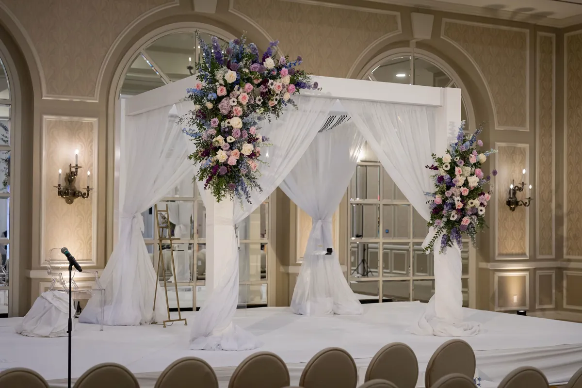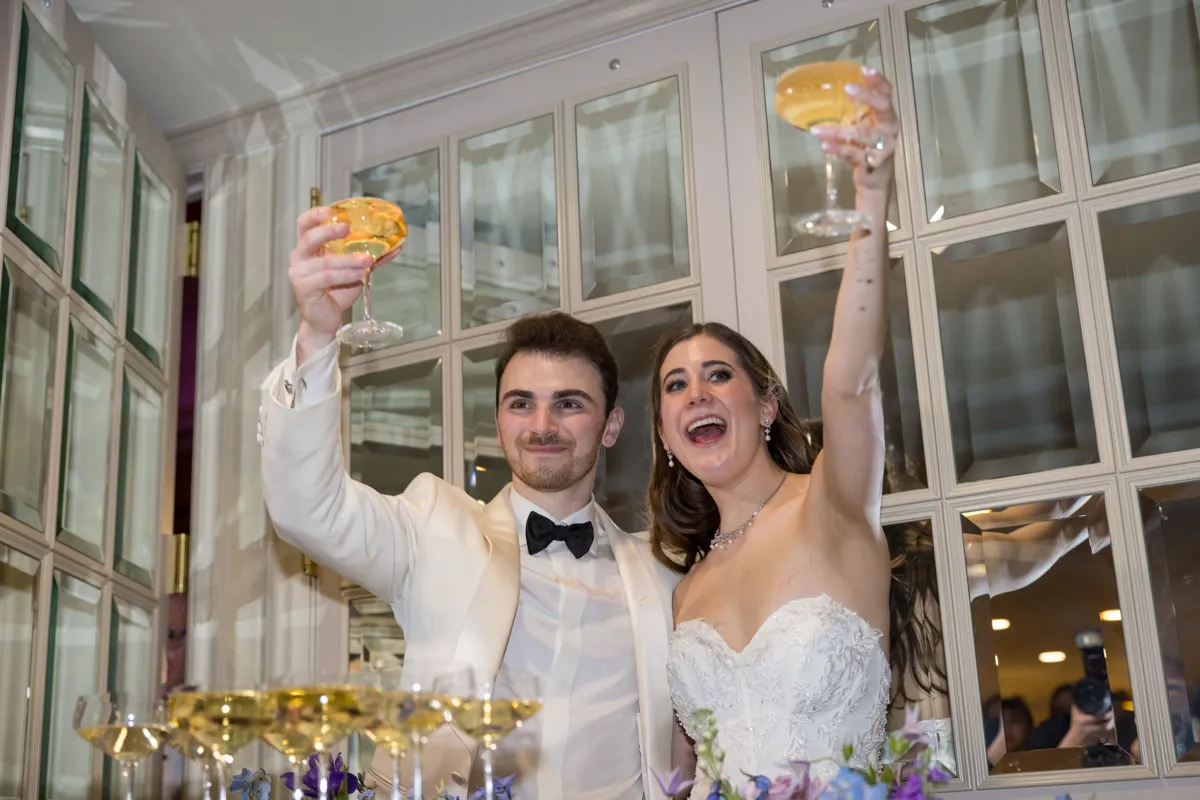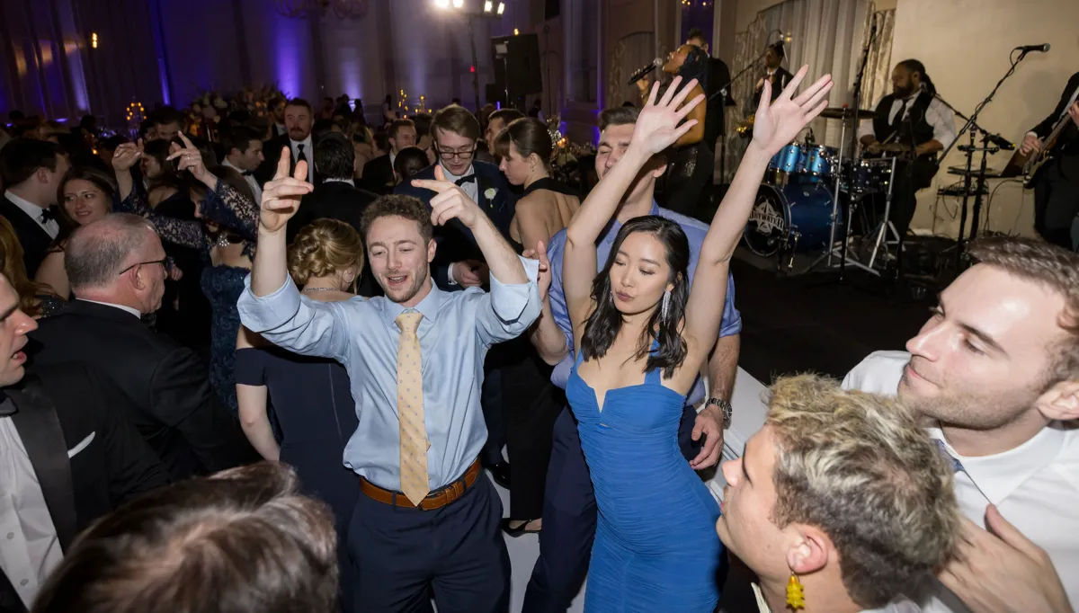 Camille & Matt’s regal wedding was a site to behold! Guests first got a taste of the elegant design with the letterpressed and engraved invitation with midnight blue and gold details designed by Significantly Said: Invitations by Significant Events. The wedding was held at a historic downtown Dallas hotel full of incredible architectural details and history. Camille’s color palette of shades of blue, shades of purple, and white looked perfect in the venue and for a winter wedding. Florals were arranged in a lovely, organic way that was both fresh and classic. Guests were greeted with champagne as they entered the ceremony room. The Jewish ceremony was held under a white chuppah adorned with a spray of florals which continued down the aisle. Cocktail Hour featured a custom made wood and floral arch for photos, a bar serving a variety of signature cocktails, as well as one poured through an ice luge with the couple’s monogram on it. The ballroom looked so elegant with crystal chandeliers and a painted ceiling above and tables below with midnight blue linens, lush florals, gold chargers and flatware, and custom paper goods. Camille & Matt’s Sweetheart Table was surrounded with a lovely meadow of floral right in front of their dance floor with custom monogram. A formal plated meal was served which guests enjoyed. Two cakes served as dessert: one a grand bridal cake and the other a football helmet shaped groom’s cake! A champagne tower provided the perfect cake pairing. A fabulous party band kept the dance floor completely packed all night. A yummy tater tot bar provided a fun late night snack. A send-off down the hotel stairs with streamers finished this incredible wedding!