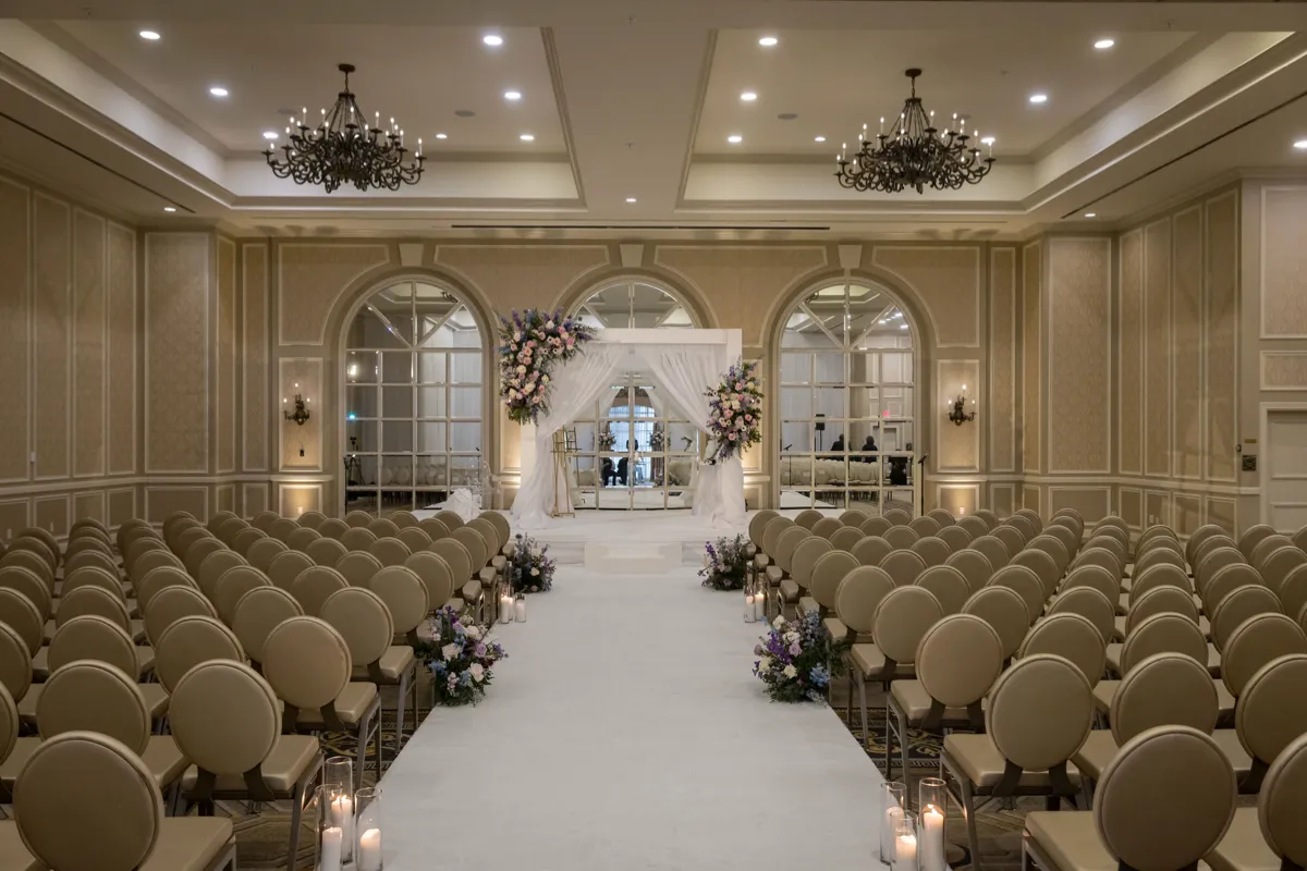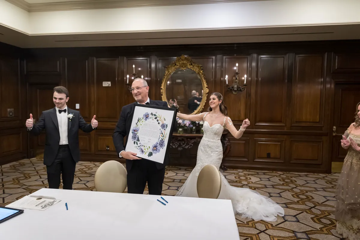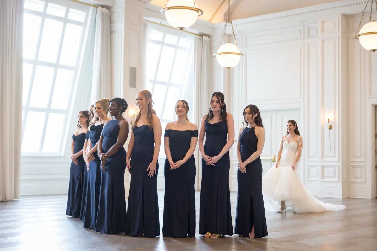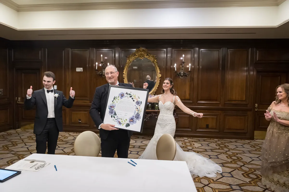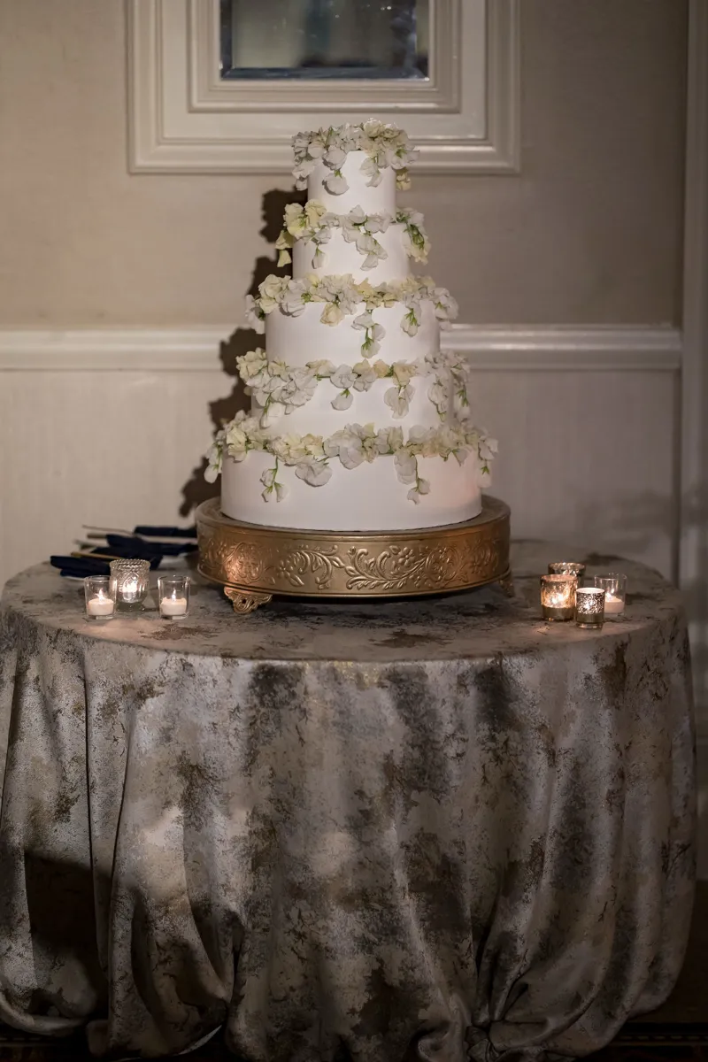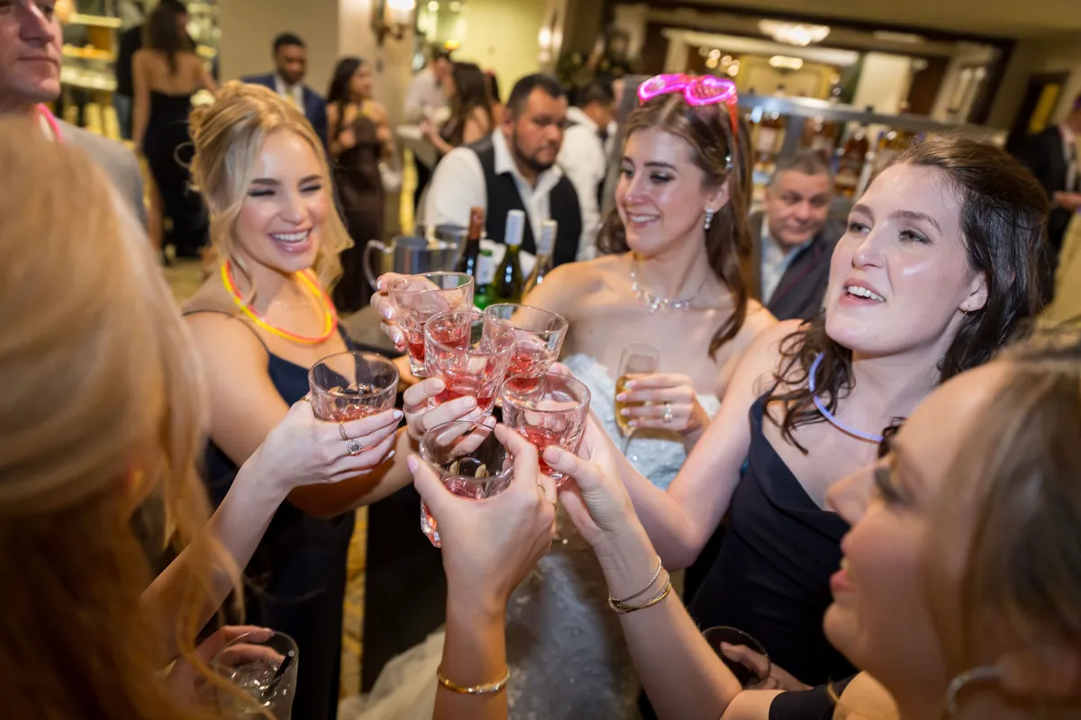 Camille & Matt’s regal wedding was a site to behold! Guests first got a taste of the elegant design with the letterpressed and engraved invitation with midnight blue and gold details designed by Significantly Said: Invitations by Significant Events. The wedding was held at a historic downtown Dallas hotel full of incredible architectural details and history. Camille’s color palette of shades of blue, shades of purple, and white looked perfect in the venue and for a winter wedding. Florals were arranged in a lovely, organic way that was both fresh and classic. Guests were greeted with champagne as they entered the ceremony room. The Jewish ceremony was held under a white chuppah adorned with a spray of florals which continued down the aisle. Cocktail Hour featured a custom made wood and floral arch for photos, a bar serving a variety of signature cocktails, as well as one poured through an ice luge with the couple’s monogram on it. The ballroom looked so elegant with crystal chandeliers and a painted ceiling above and tables below with midnight blue linens, lush florals, gold chargers and flatware, and custom paper goods. Camille & Matt’s Sweetheart Table was surrounded with a lovely meadow of floral right in front of their dance floor with custom monogram. A formal plated meal was served which guests enjoyed. Two cakes served as dessert: one a grand bridal cake and the other a football helmet shaped groom’s cake! A champagne tower provided the perfect cake pairing. A fabulous party band kept the dance floor completely packed all night. A yummy tater tot bar provided a fun late night snack. A send-off down the hotel stairs with streamers finished this incredible wedding!