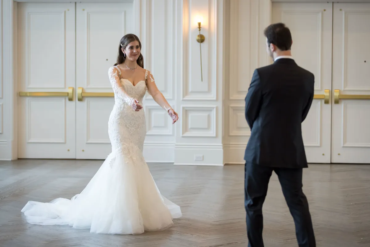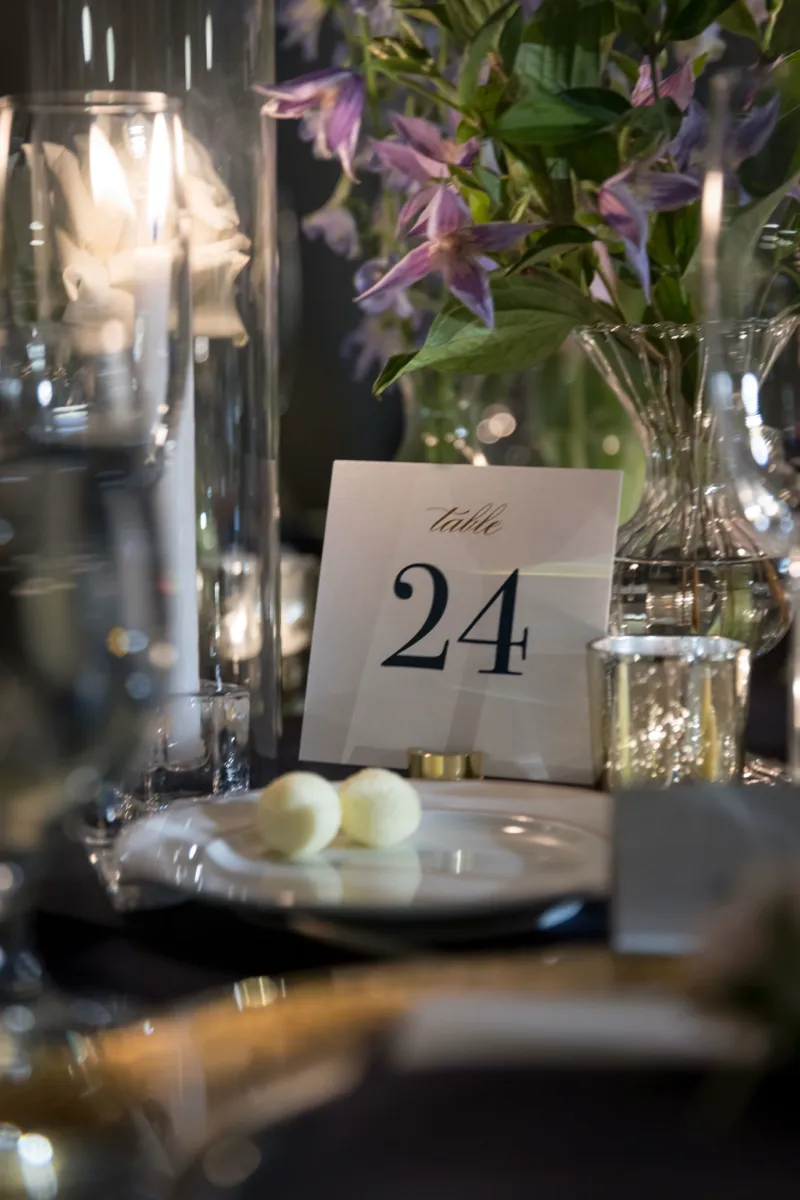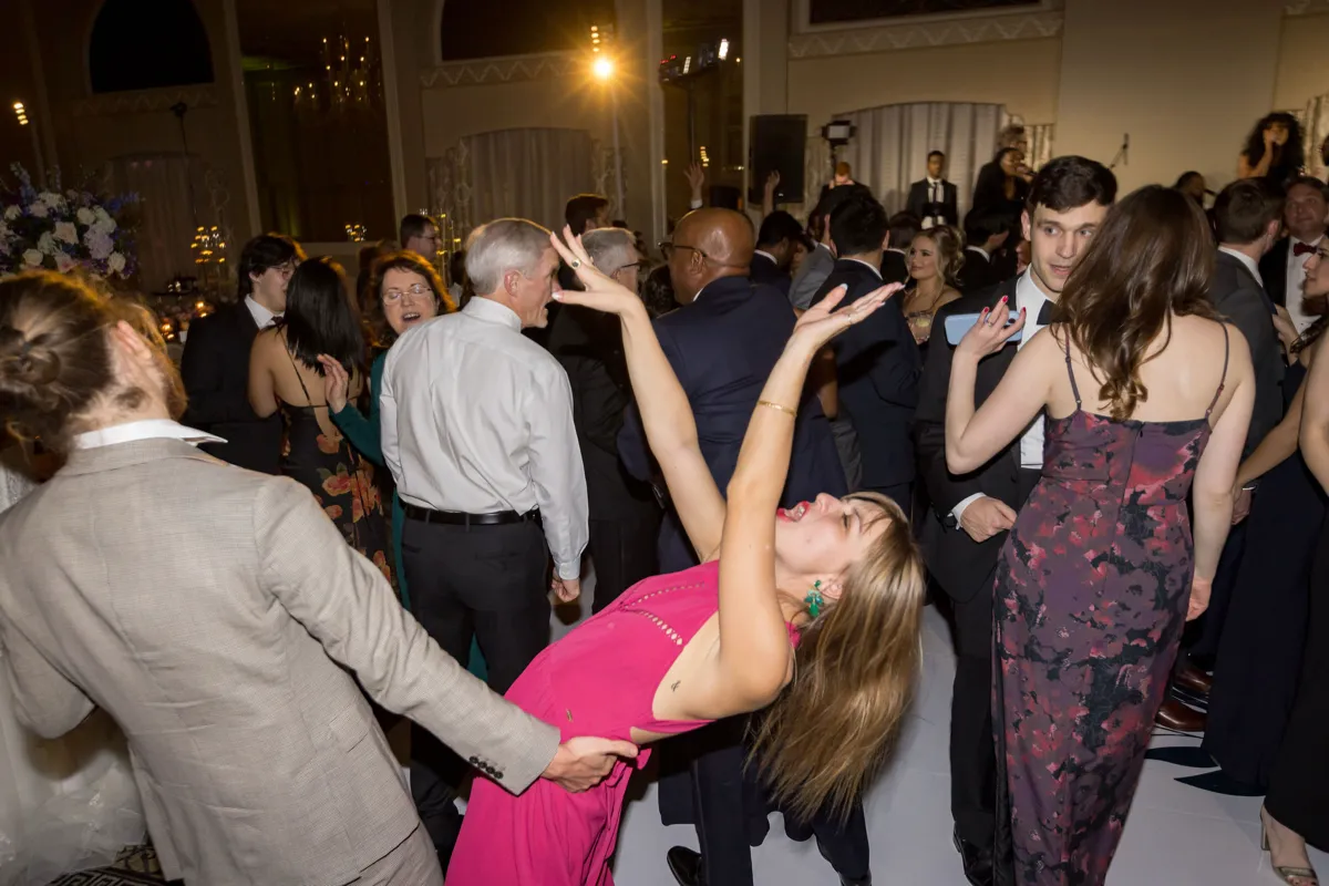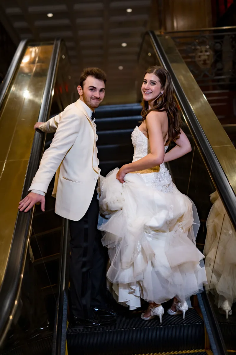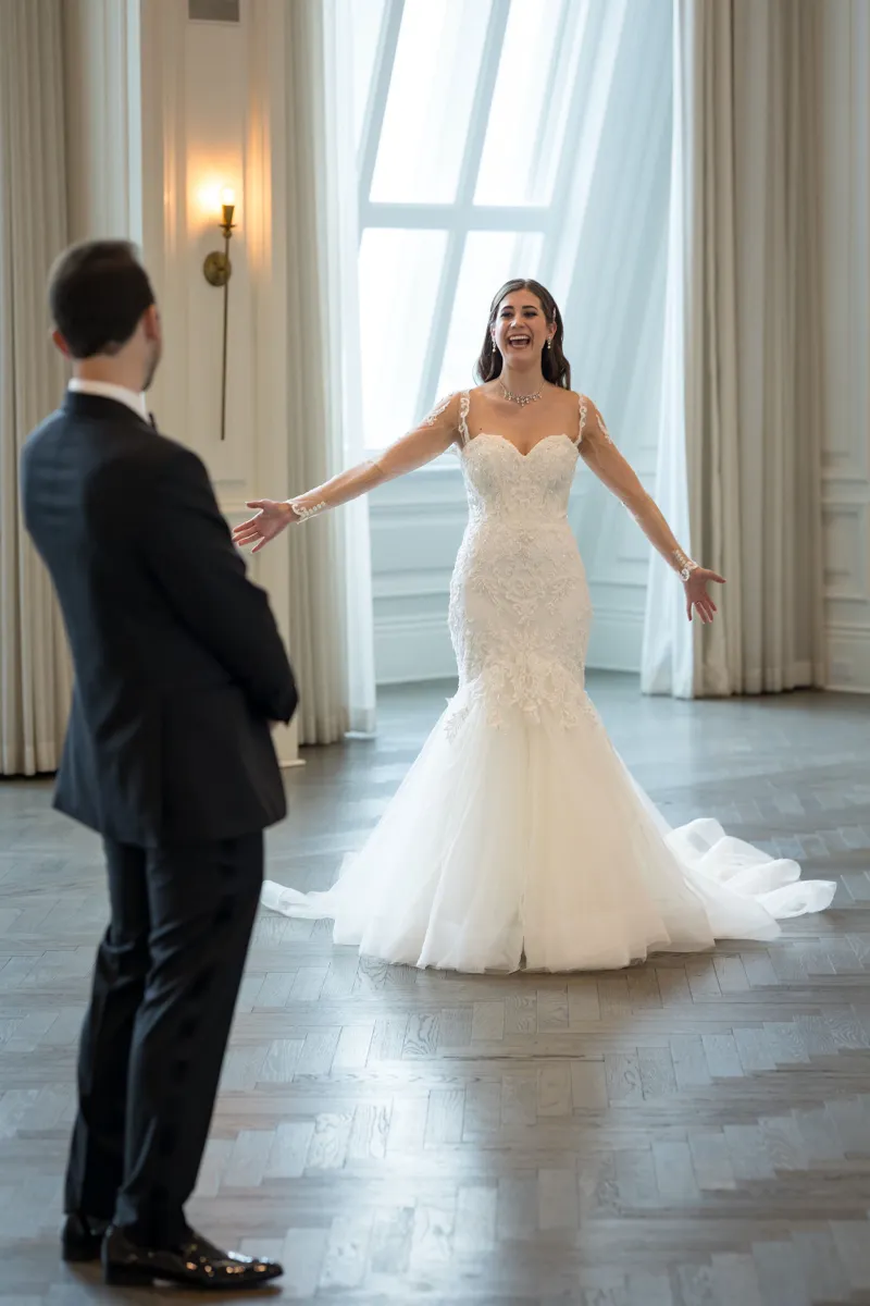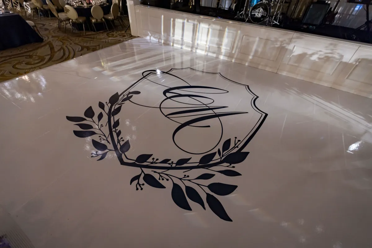 Camille & Matt’s regal wedding was a site to behold! Guests first got a taste of the elegant design with the letterpressed and engraved invitation with midnight blue and gold details designed by Significantly Said: Invitations by Significant Events. The wedding was held at a historic downtown Dallas hotel full of incredible architectural details and history. Camille’s color palette of shades of blue, shades of purple, and white looked perfect in the venue and for a winter wedding. Florals were arranged in a lovely, organic way that was both fresh and classic. Guests were greeted with champagne as they entered the ceremony room. The Jewish ceremony was held under a white chuppah adorned with a spray of florals which continued down the aisle. Cocktail Hour featured a custom made wood and floral arch for photos, a bar serving a variety of signature cocktails, as well as one poured through an ice luge with the couple’s monogram on it. The ballroom looked so elegant with crystal chandeliers and a painted ceiling above and tables below with midnight blue linens, lush florals, gold chargers and flatware, and custom paper goods. Camille & Matt’s Sweetheart Table was surrounded with a lovely meadow of floral right in front of their dance floor with custom monogram. A formal plated meal was served which guests enjoyed. Two cakes served as dessert: one a grand bridal cake and the other a football helmet shaped groom’s cake! A champagne tower provided the perfect cake pairing. A fabulous party band kept the dance floor completely packed all night. A yummy tater tot bar provided a fun late night snack. A send-off down the hotel stairs with streamers finished this incredible wedding!