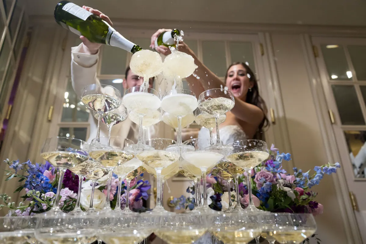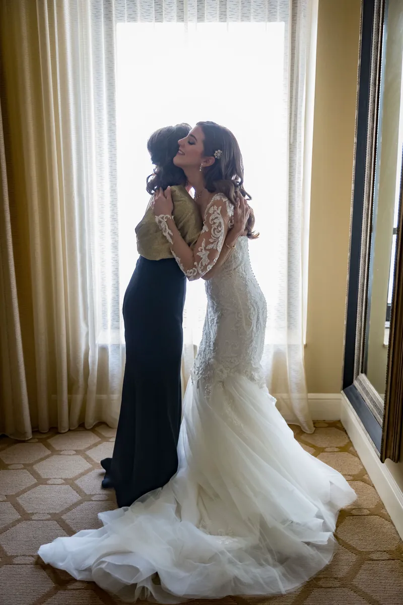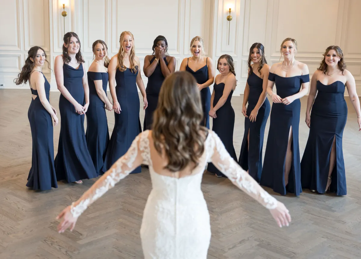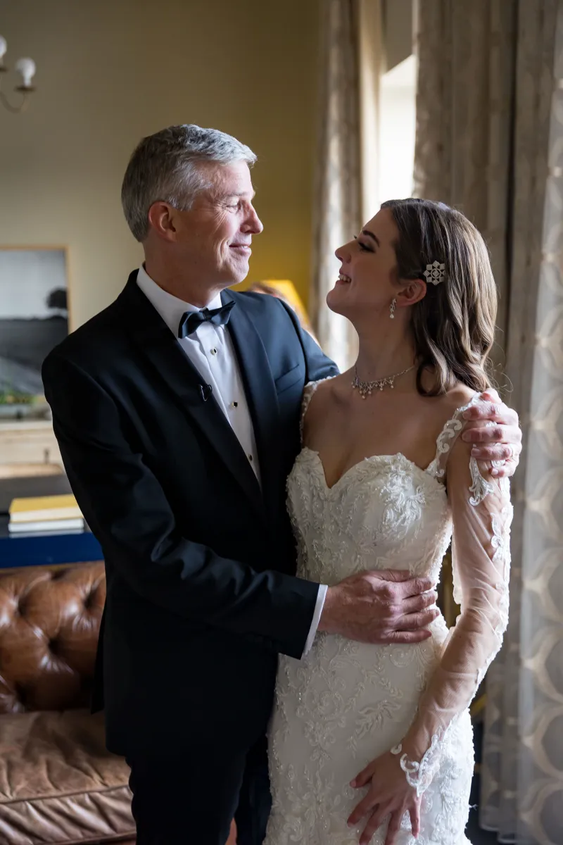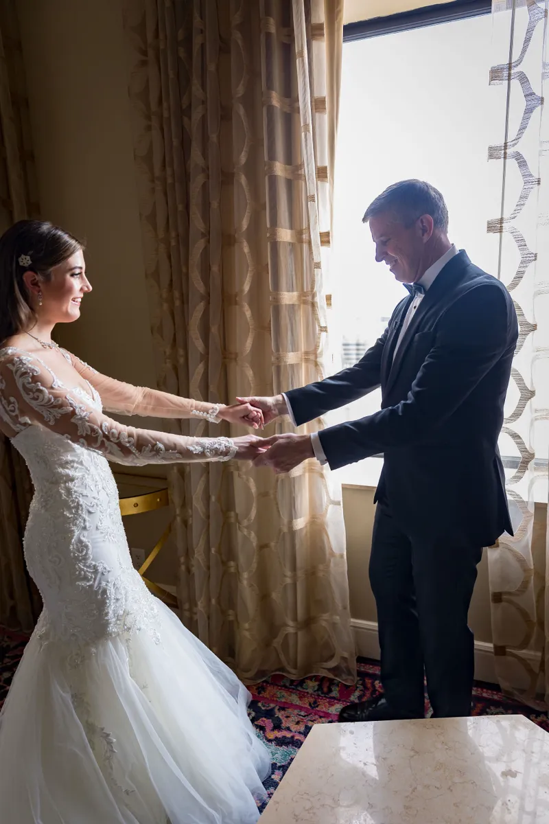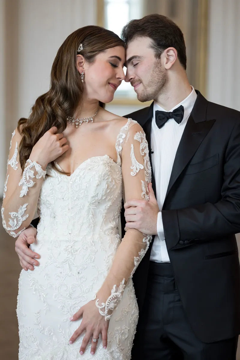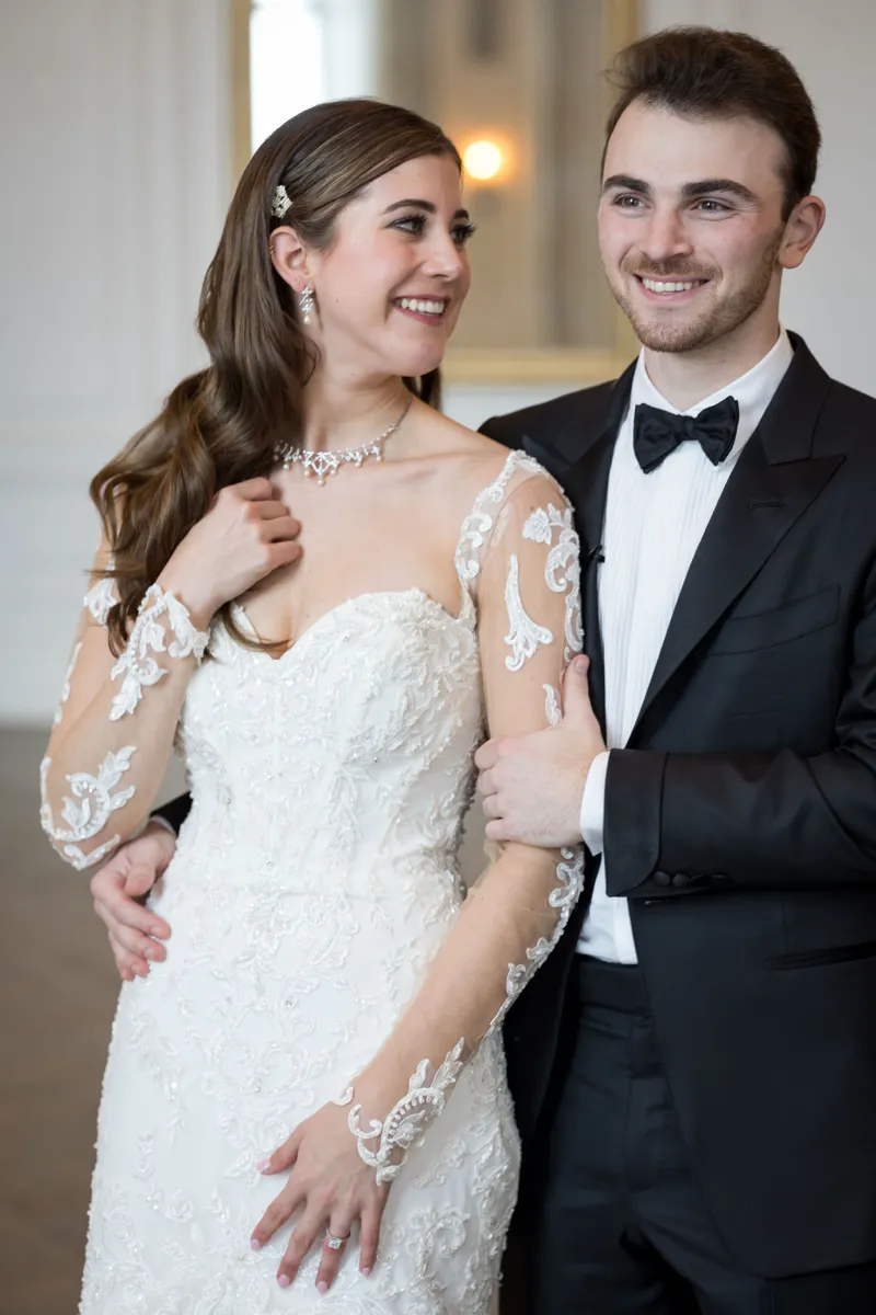 Camille & Matt’s regal wedding was a site to behold! Guests first got a taste of the elegant design with the letterpressed and engraved invitation with midnight blue and gold details designed by Significantly Said: Invitations by Significant Events. The wedding was held at a historic downtown Dallas hotel full of incredible architectural details and history. Camille’s color palette of shades of blue, shades of purple, and white looked perfect in the venue and for a winter wedding. Florals were arranged in a lovely, organic way that was both fresh and classic. Guests were greeted with champagne as they entered the ceremony room. The Jewish ceremony was held under a white chuppah adorned with a spray of florals which continued down the aisle. Cocktail Hour featured a custom made wood and floral arch for photos, a bar serving a variety of signature cocktails, as well as one poured through an ice luge with the couple’s monogram on it. The ballroom looked so elegant with crystal chandeliers and a painted ceiling above and tables below with midnight blue linens, lush florals, gold chargers and flatware, and custom paper goods. Camille & Matt’s Sweetheart Table was surrounded with a lovely meadow of floral right in front of their dance floor with custom monogram. A formal plated meal was served which guests enjoyed. Two cakes served as dessert: one a grand bridal cake and the other a football helmet shaped groom’s cake! A champagne tower provided the perfect cake pairing. A fabulous party band kept the dance floor completely packed all night. A yummy tater tot bar provided a fun late night snack. A send-off down the hotel stairs with streamers finished this incredible wedding!