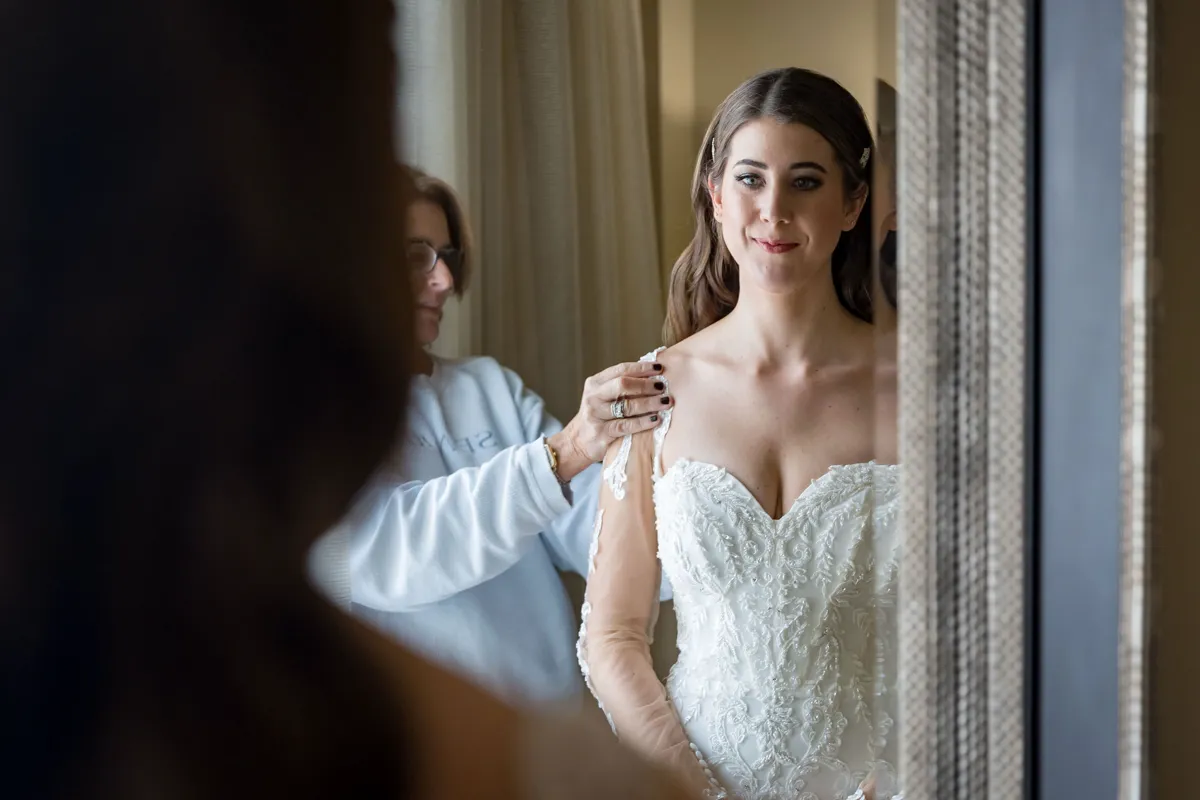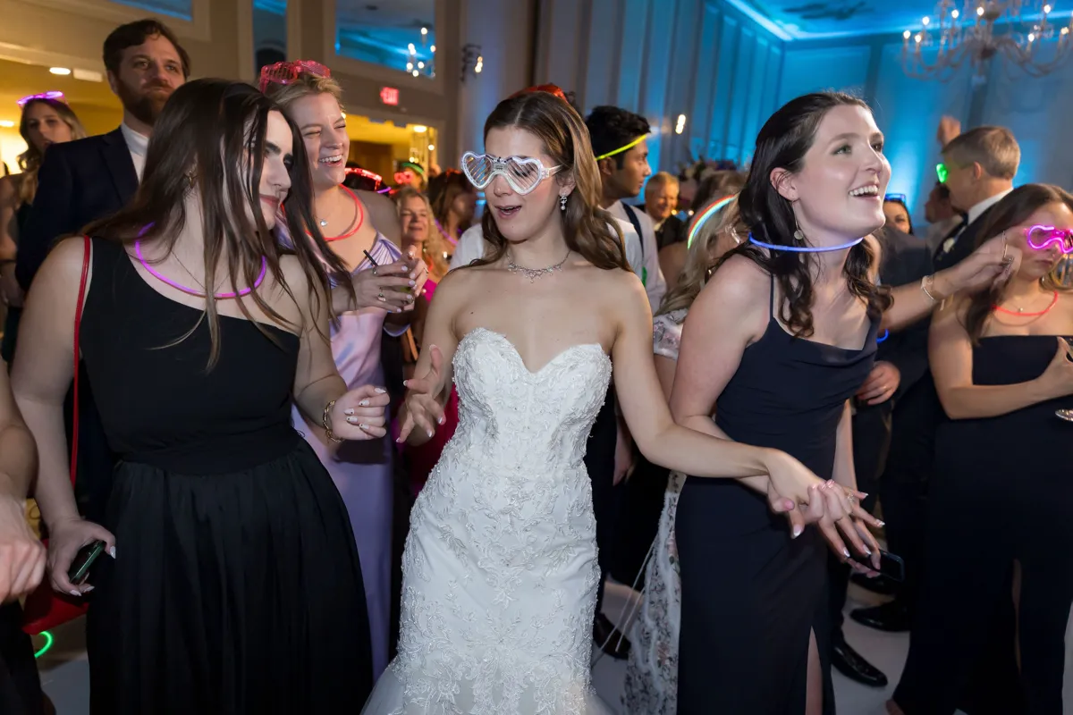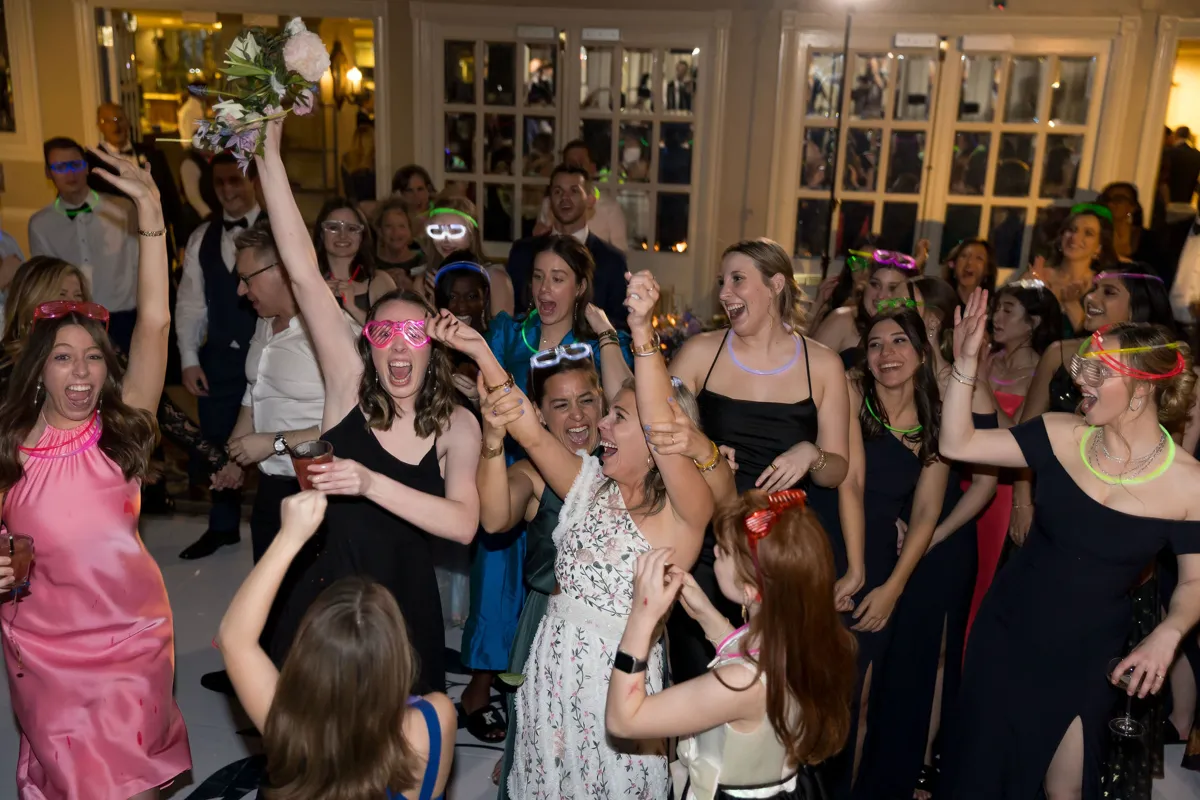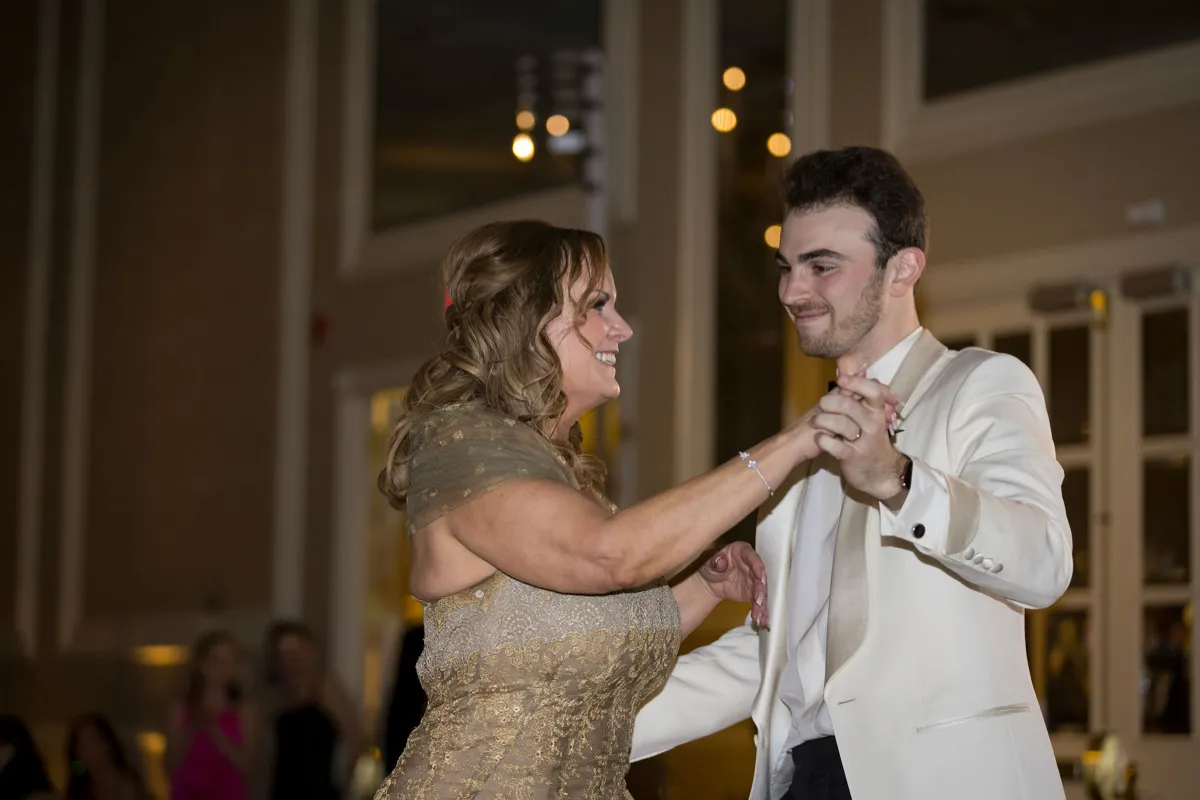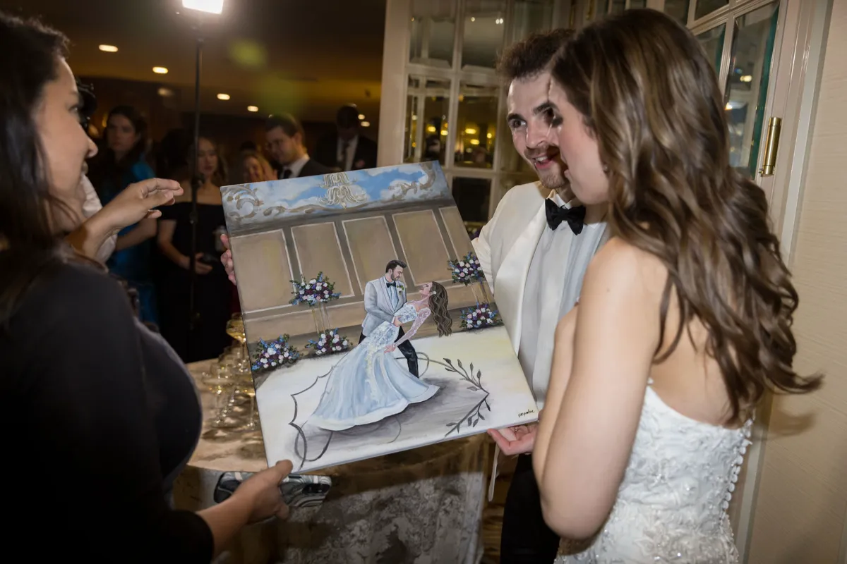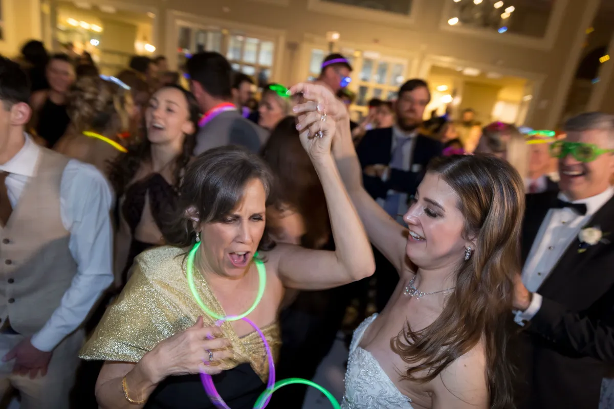Camille & Matt’s regal wedding was a site to behold! Guests first got a taste of the elegant design with the letterpressed and engraved invitation with midnight blue and gold details designed by Significantly Said: Invitations by Significant Events. The wedding was held at a historic downtown Dallas hotel full of incredible architectural details and history. Camille’s color palette of shades of blue, shades of purple, and white looked perfect in the venue and for a winter wedding. Florals were arranged in a lovely, organic way that was both fresh and classic. Guests were greeted with champagne as they entered the ceremony room. The Jewish ceremony was held under a white chuppah adorned with a spray of florals which continued down the aisle. Cocktail Hour featured a custom made wood and floral arch for photos, a bar serving a variety of signature cocktails, as well as one poured through an ice luge with the couple’s monogram on it. The ballroom looked so elegant with crystal chandeliers and a painted ceiling above and tables below with midnight blue linens, lush florals, gold chargers and flatware, and custom paper goods. Camille & Matt’s Sweetheart Table was surrounded with a lovely meadow of floral right in front of their dance floor with custom monogram. A formal plated meal was served which guests enjoyed. Two cakes served as dessert: one a grand bridal cake and the other a football helmet shaped groom’s cake! A champagne tower provided the perfect cake pairing. A fabulous party band kept the dance floor completely packed all night. A yummy tater tot bar provided a fun late night snack. A send-off down the hotel stairs with streamers finished this incredible wedding!