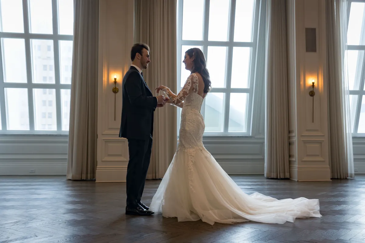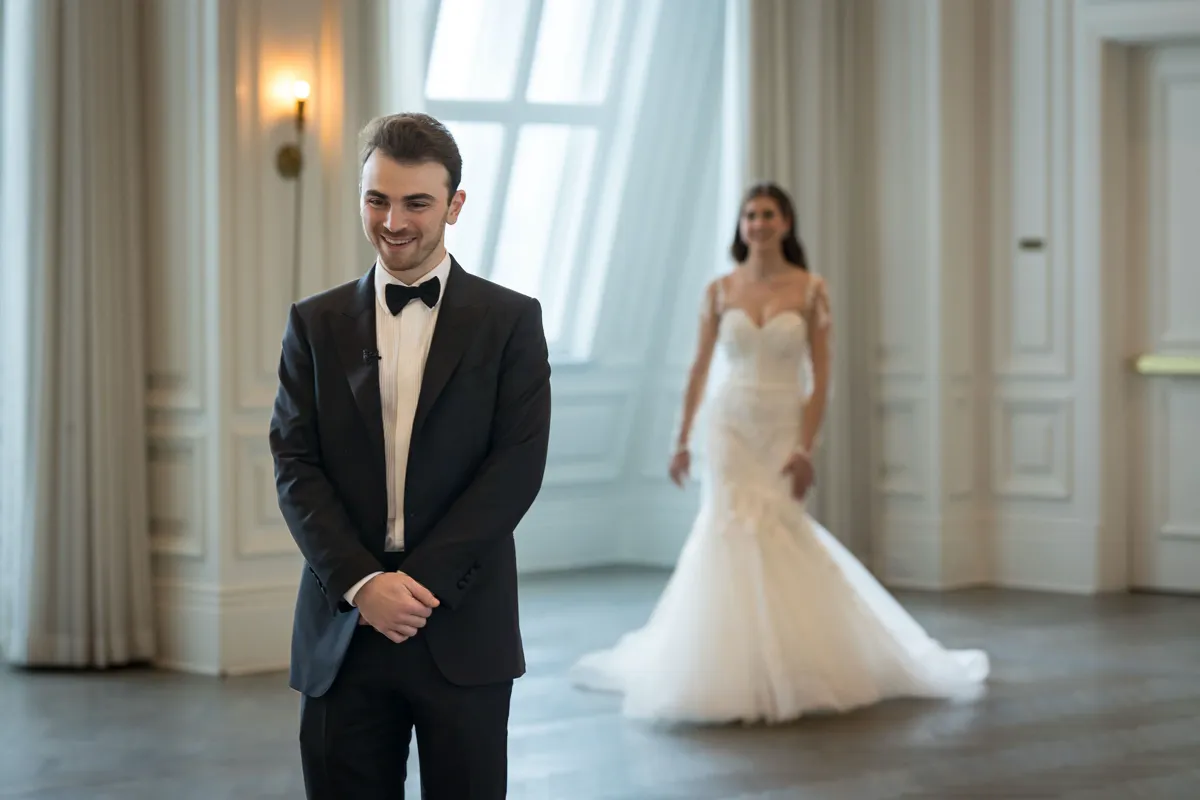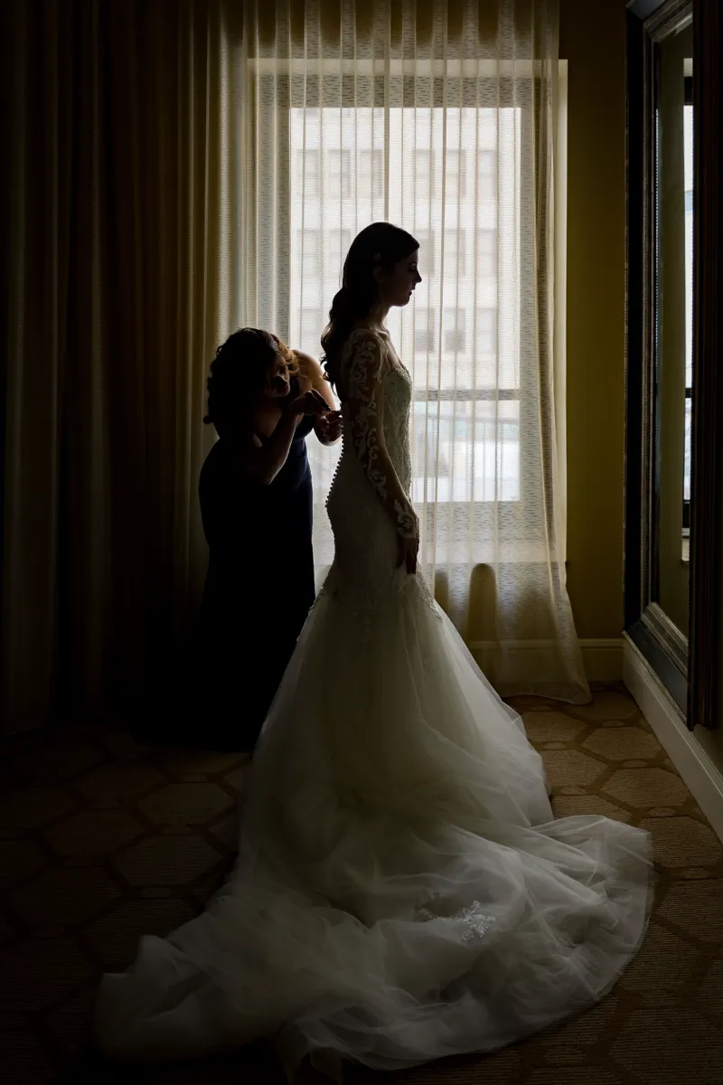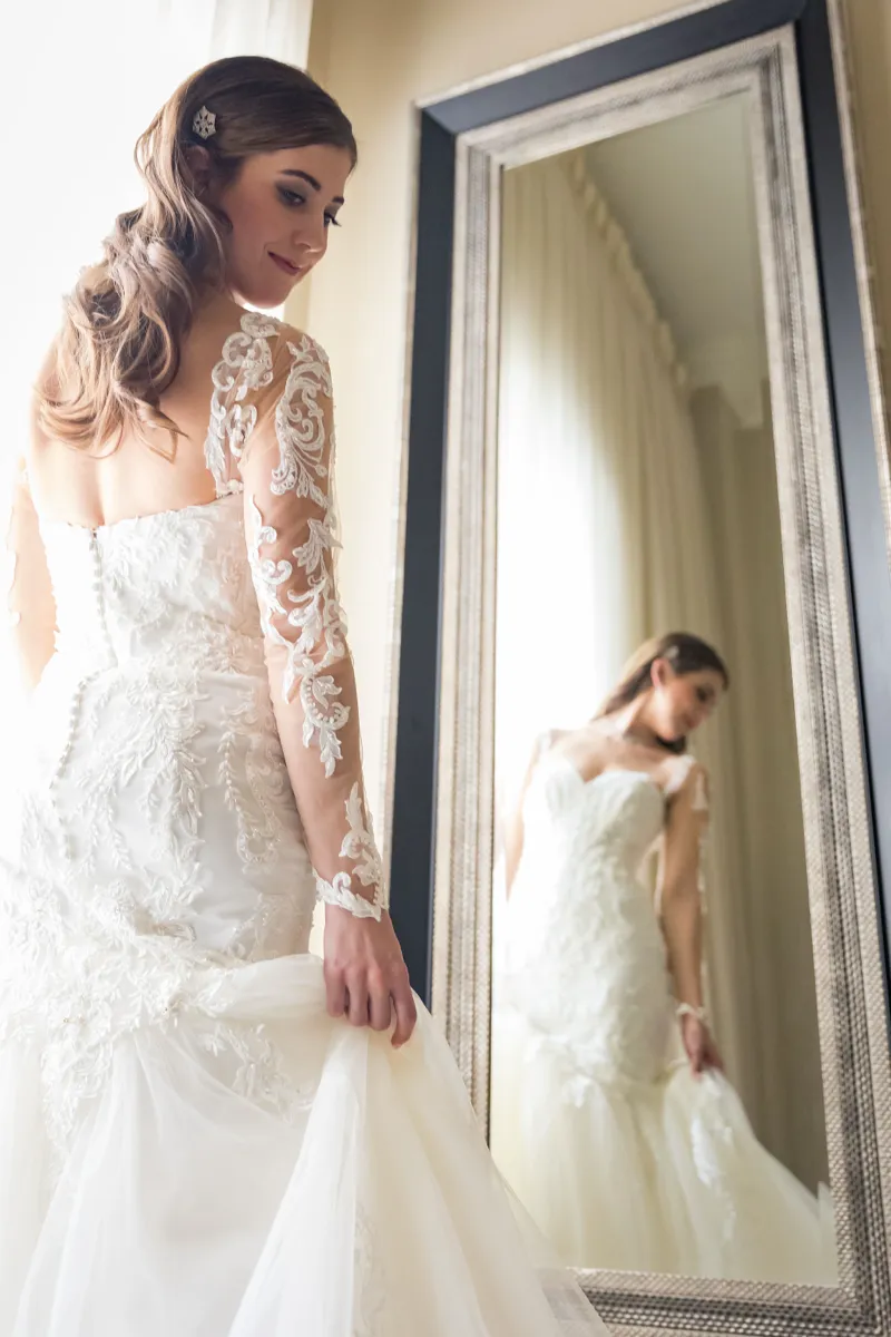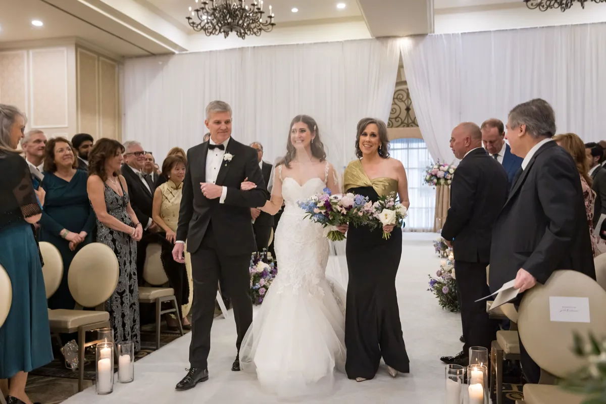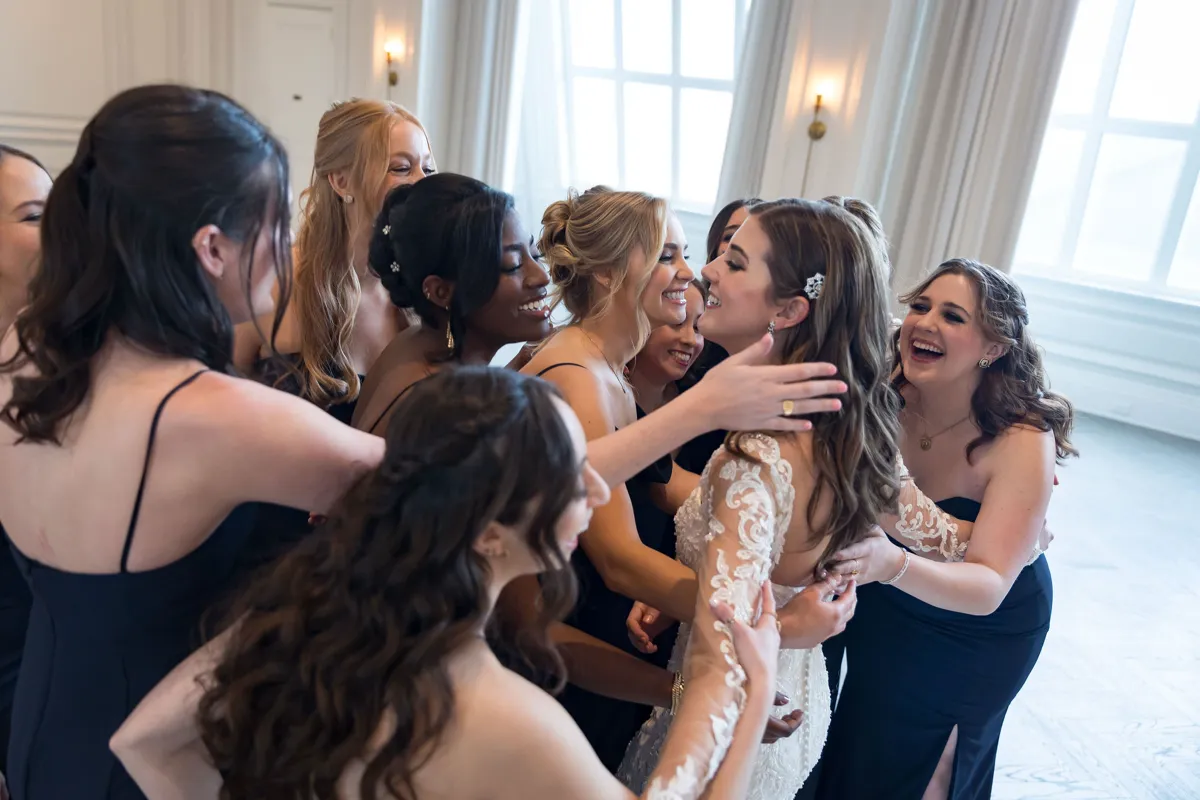 Camille & Matt’s regal wedding was a site to behold! Guests first got a taste of the elegant design with the letterpressed and engraved invitation with midnight blue and gold details designed by Significantly Said: Invitations by Significant Events. The wedding was held at a historic downtown Dallas hotel full of incredible architectural details and history. Camille’s color palette of shades of blue, shades of purple, and white looked perfect in the venue and for a winter wedding. Florals were arranged in a lovely, organic way that was both fresh and classic. Guests were greeted with champagne as they entered the ceremony room. The Jewish ceremony was held under a white chuppah adorned with a spray of florals which continued down the aisle. Cocktail Hour featured a custom made wood and floral arch for photos, a bar serving a variety of signature cocktails, as well as one poured through an ice luge with the couple’s monogram on it. The ballroom looked so elegant with crystal chandeliers and a painted ceiling above and tables below with midnight blue linens, lush florals, gold chargers and flatware, and custom paper goods. Camille & Matt’s Sweetheart Table was surrounded with a lovely meadow of floral right in front of their dance floor with custom monogram. A formal plated meal was served which guests enjoyed. Two cakes served as dessert: one a grand bridal cake and the other a football helmet shaped groom’s cake! A champagne tower provided the perfect cake pairing. A fabulous party band kept the dance floor completely packed all night. A yummy tater tot bar provided a fun late night snack. A send-off down the hotel stairs with streamers finished this incredible wedding!