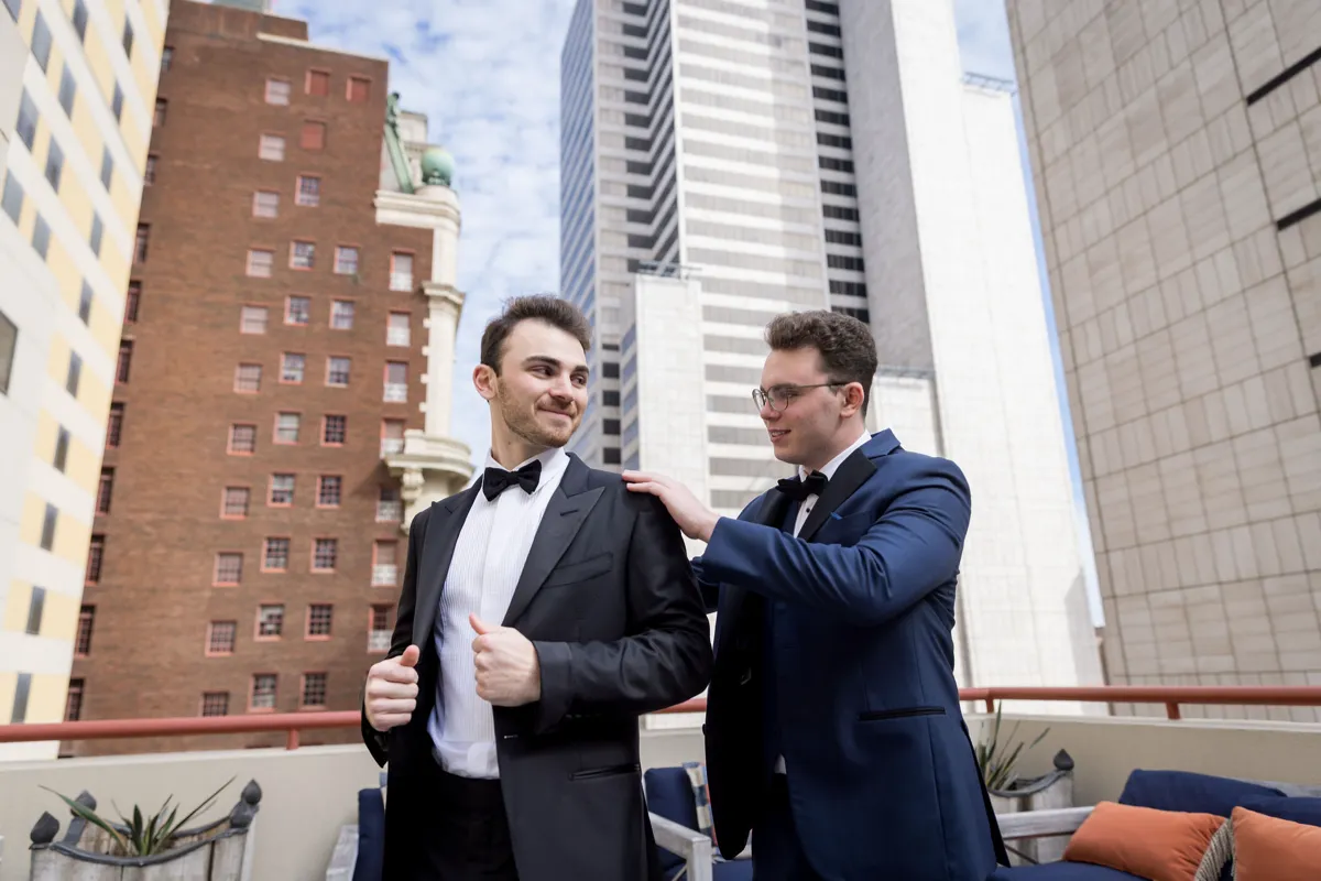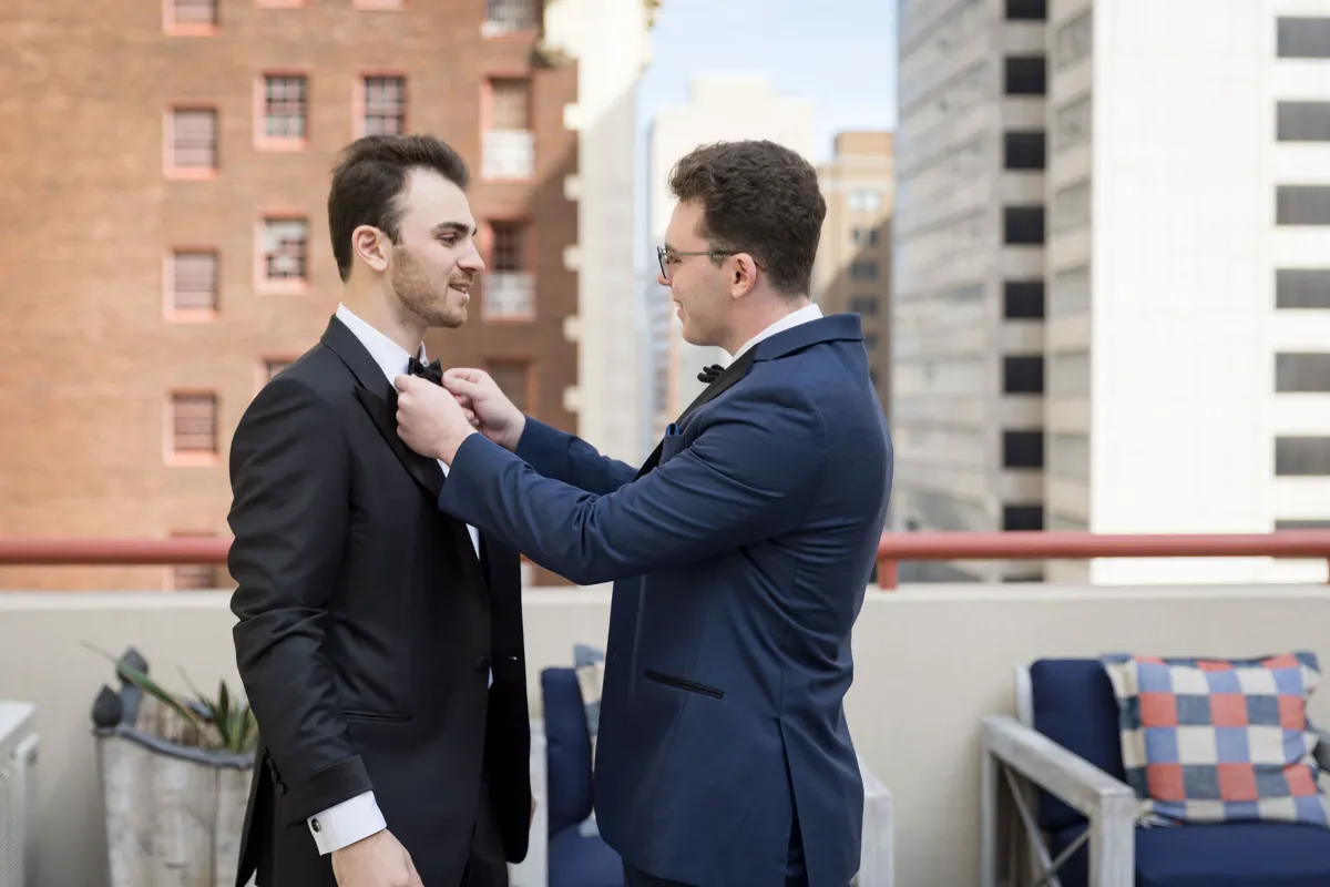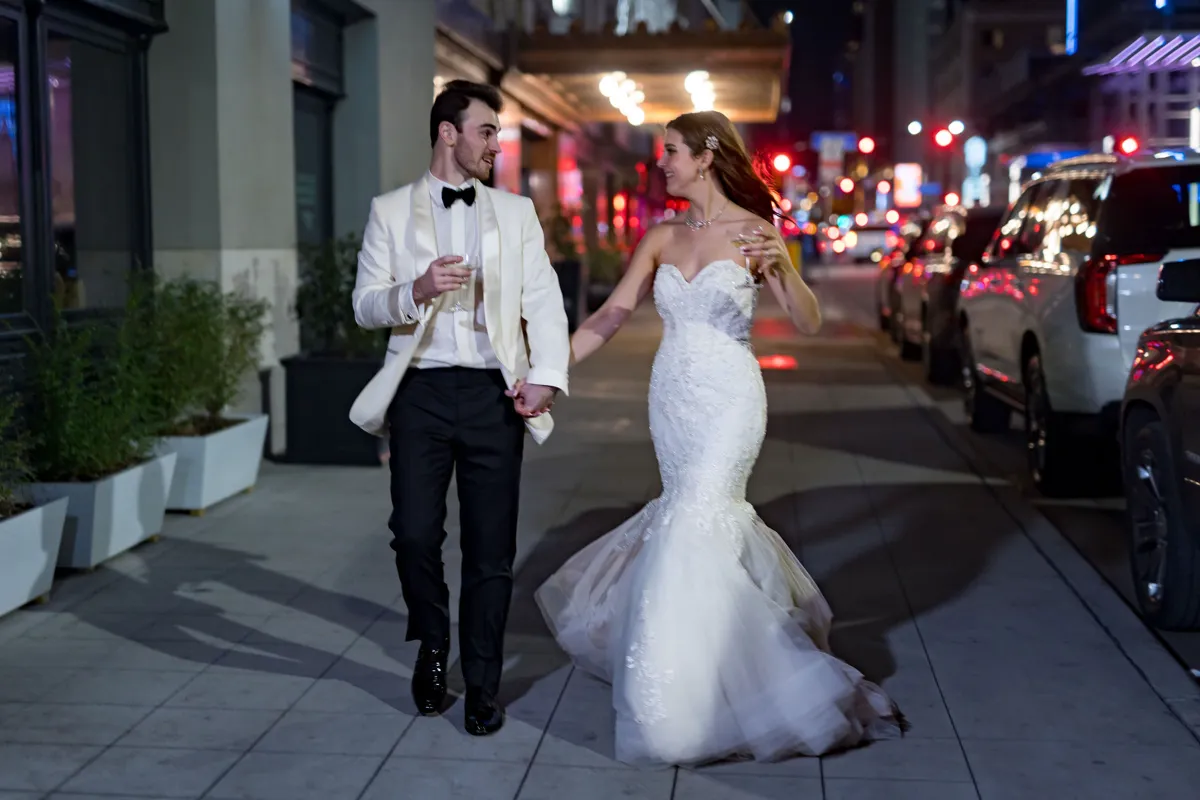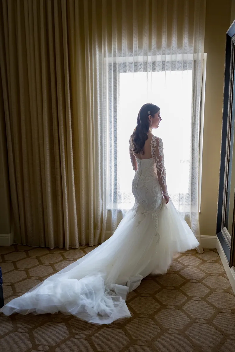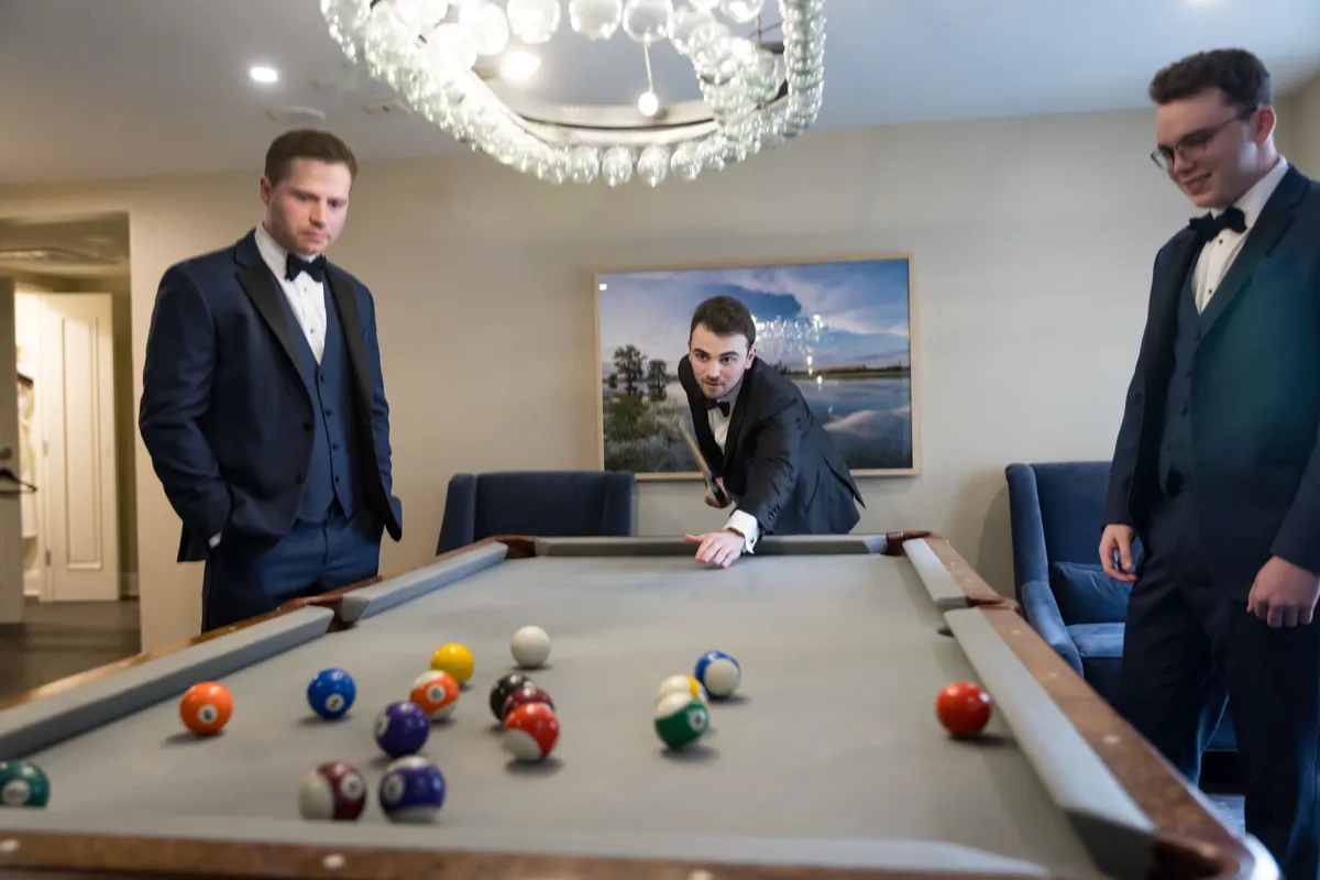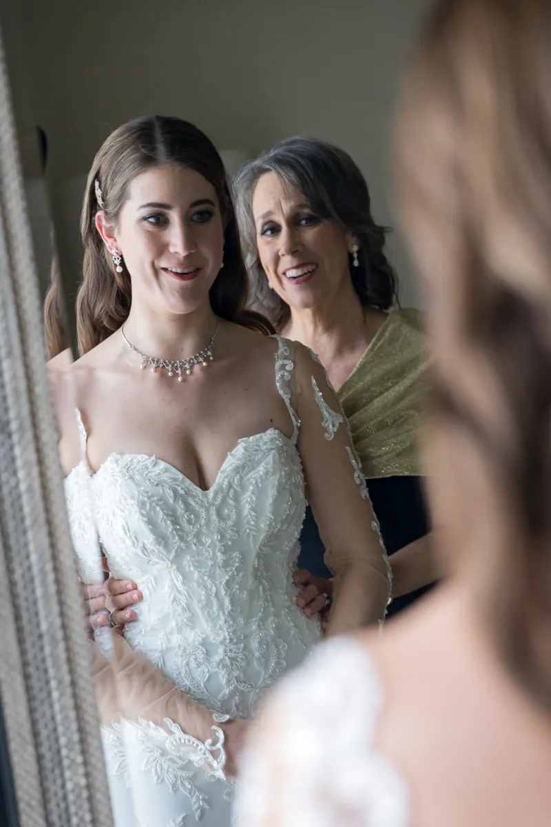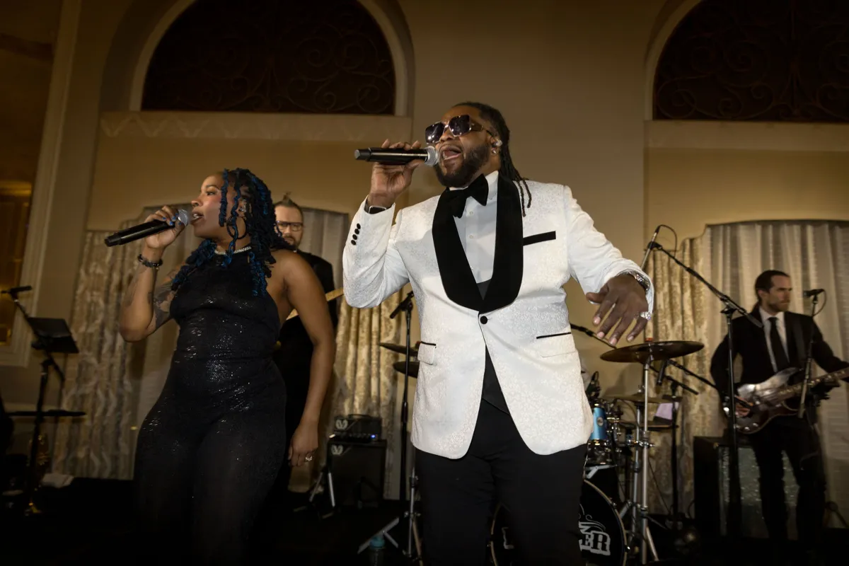 Camille & Matt’s regal wedding was a site to behold! Guests first got a taste of the elegant design with the letterpressed and engraved invitation with midnight blue and gold details designed by Significantly Said: Invitations by Significant Events. The wedding was held at a historic downtown Dallas hotel full of incredible architectural details and history. Camille’s color palette of shades of blue, shades of purple, and white looked perfect in the venue and for a winter wedding. Florals were arranged in a lovely, organic way that was both fresh and classic. Guests were greeted with champagne as they entered the ceremony room. The Jewish ceremony was held under a white chuppah adorned with a spray of florals which continued down the aisle. Cocktail Hour featured a custom made wood and floral arch for photos, a bar serving a variety of signature cocktails, as well as one poured through an ice luge with the couple’s monogram on it. The ballroom looked so elegant with crystal chandeliers and a painted ceiling above and tables below with midnight blue linens, lush florals, gold chargers and flatware, and custom paper goods. Camille & Matt’s Sweetheart Table was surrounded with a lovely meadow of floral right in front of their dance floor with custom monogram. A formal plated meal was served which guests enjoyed. Two cakes served as dessert: one a grand bridal cake and the other a football helmet shaped groom’s cake! A champagne tower provided the perfect cake pairing. A fabulous party band kept the dance floor completely packed all night. A yummy tater tot bar provided a fun late night snack. A send-off down the hotel stairs with streamers finished this incredible wedding!