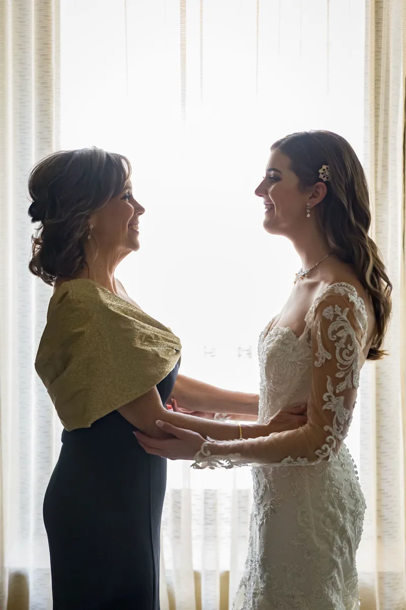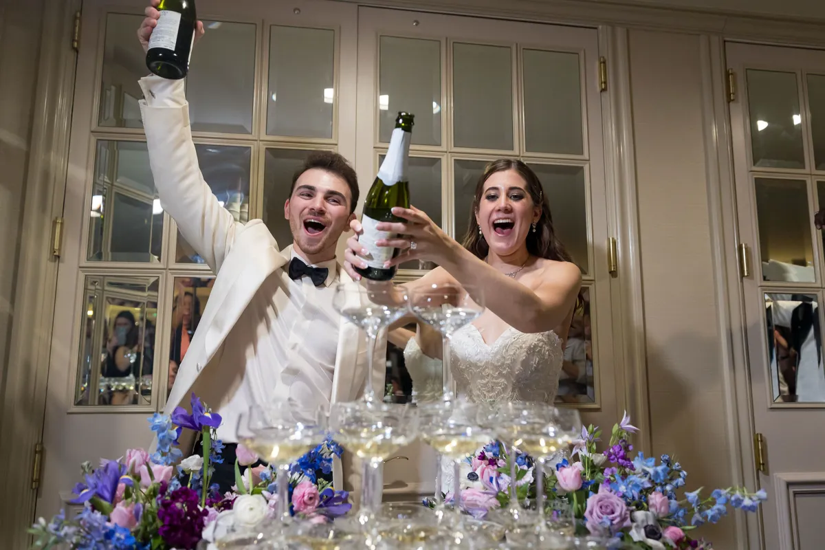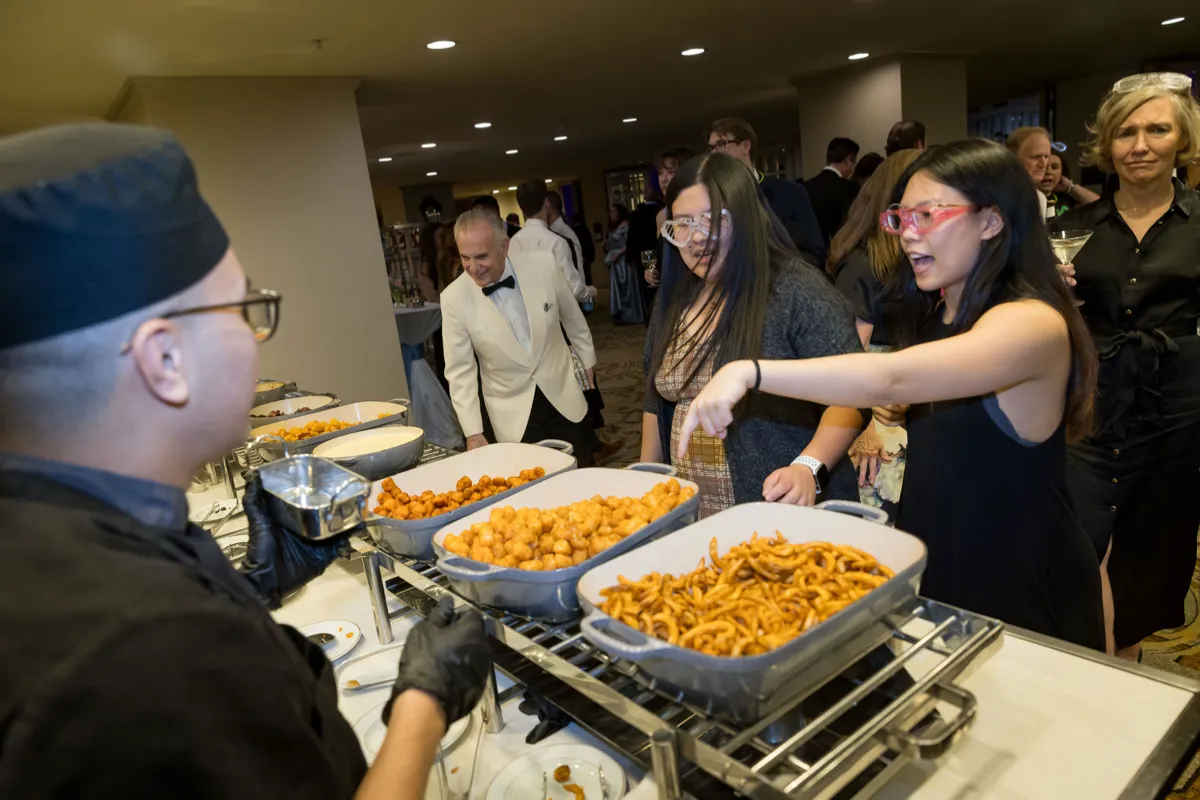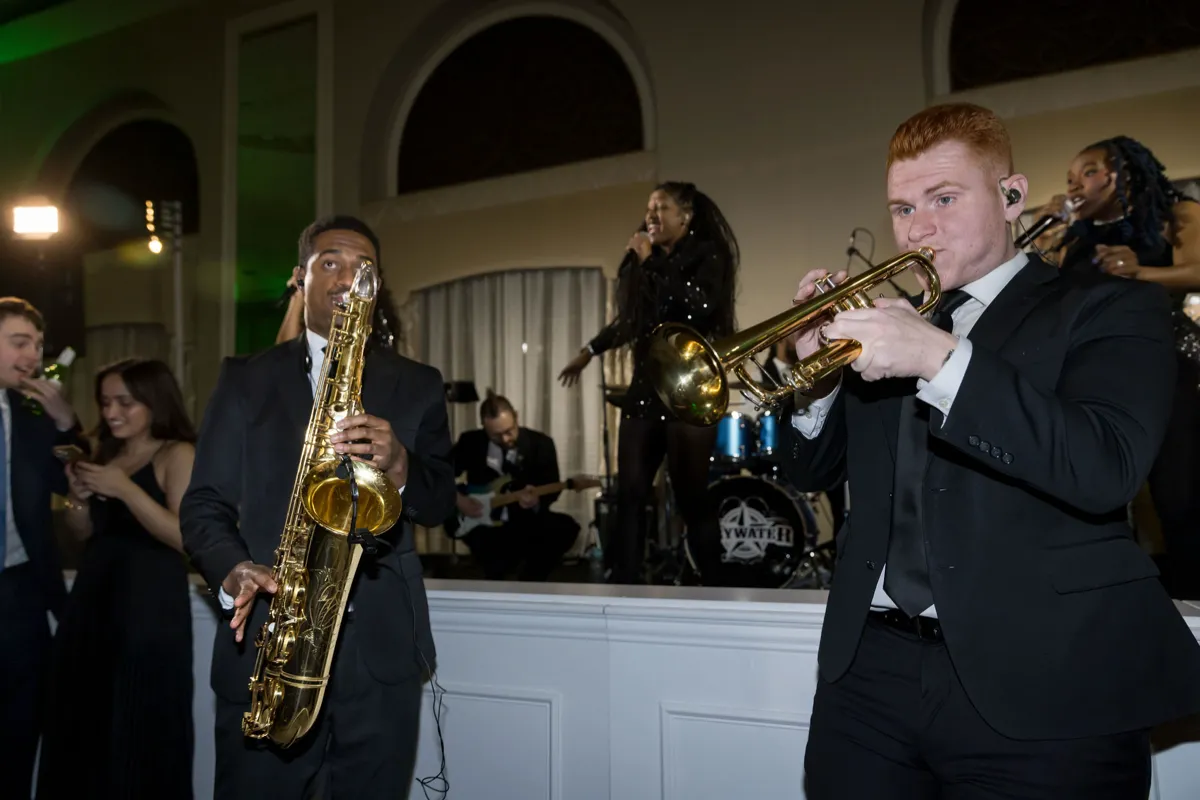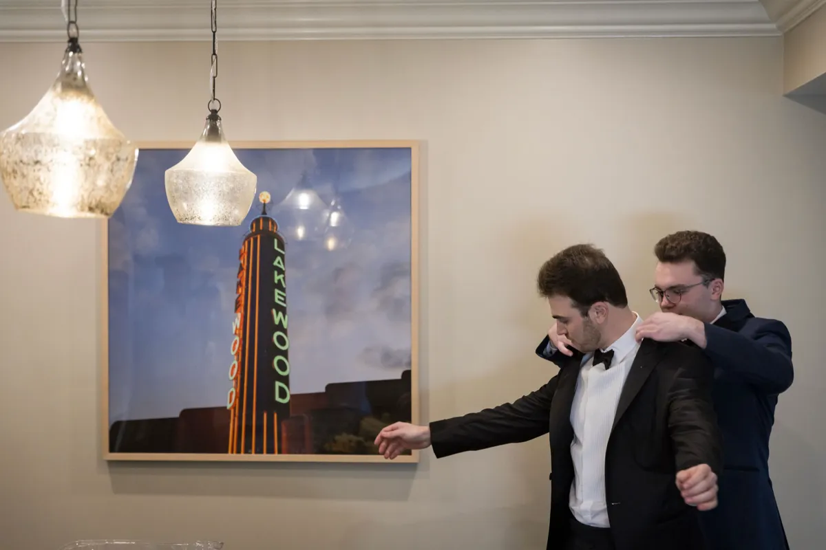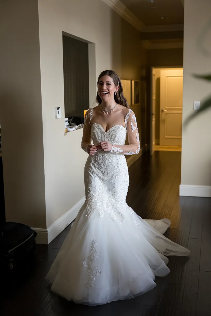 Camille & Matt’s regal wedding was a site to behold! Guests first got a taste of the elegant design with the letterpressed and engraved invitation with midnight blue and gold details designed by Significantly Said: Invitations by Significant Events. The wedding was held at a historic downtown Dallas hotel full of incredible architectural details and history. Camille’s color palette of shades of blue, shades of purple, and white looked perfect in the venue and for a winter wedding. Florals were arranged in a lovely, organic way that was both fresh and classic. Guests were greeted with champagne as they entered the ceremony room. The Jewish ceremony was held under a white chuppah adorned with a spray of florals which continued down the aisle. Cocktail Hour featured a custom made wood and floral arch for photos, a bar serving a variety of signature cocktails, as well as one poured through an ice luge with the couple’s monogram on it. The ballroom looked so elegant with crystal chandeliers and a painted ceiling above and tables below with midnight blue linens, lush florals, gold chargers and flatware, and custom paper goods. Camille & Matt’s Sweetheart Table was surrounded with a lovely meadow of floral right in front of their dance floor with custom monogram. A formal plated meal was served which guests enjoyed. Two cakes served as dessert: one a grand bridal cake and the other a football helmet shaped groom’s cake! A champagne tower provided the perfect cake pairing. A fabulous party band kept the dance floor completely packed all night. A yummy tater tot bar provided a fun late night snack. A send-off down the hotel stairs with streamers finished this incredible wedding!